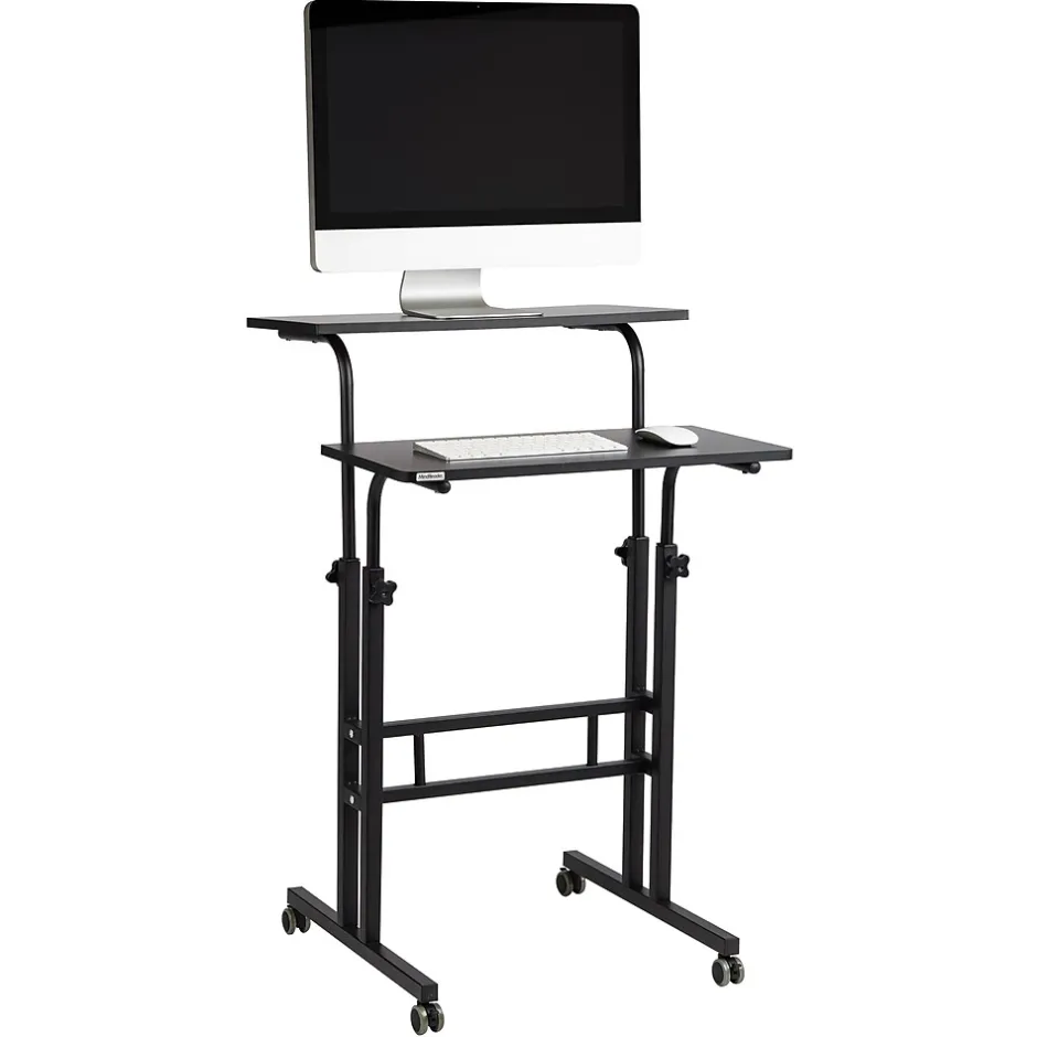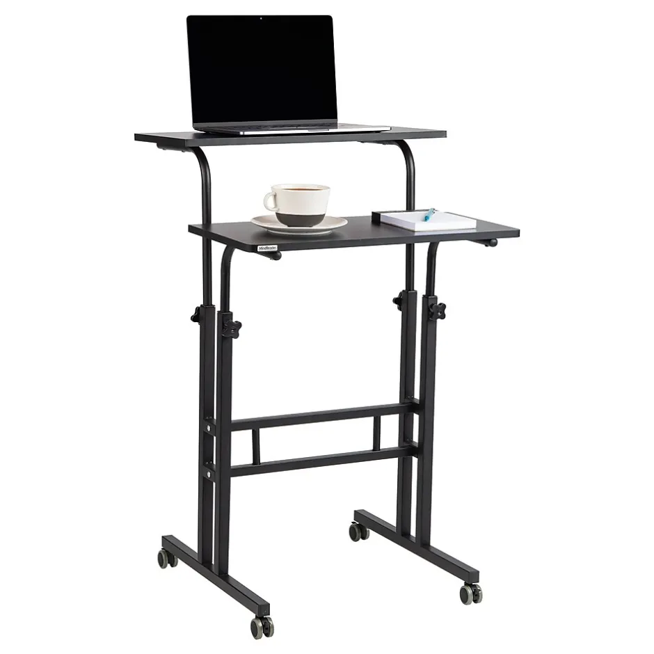 This versatile workstation adapts to your workday and lifestyle. This innovative two-tiered desk offers the flexibility to sit or stand while working and provides ample space for other items. The adjustable desktop allows you to work at the perfect height, making it ideal for a variety of tasks.Despite its sturdy construction, this mobile desk is easy to move, thanks to the four lockable casters. With dimensions of 23.5 inches long, 19.5 inches wide, and an adjustable height of up to 39 inches, this desk is perfect for any work or study space.Made of durable MDF and steel, the Mobile Sit/Stand Desk is built to withstand daily use and is easy to clean with a soft cloth and mild soap. A thoughtful gift for college students or remote workers, this flexible workstation is the perfect addition to any home or office.Embrace a dynamic work lifestyle with the Mobile Sit/Stand Desk – your one-stop solution for a comfortable and efficient workspace.
