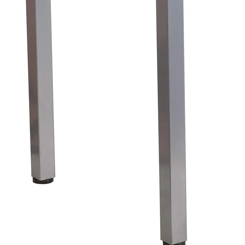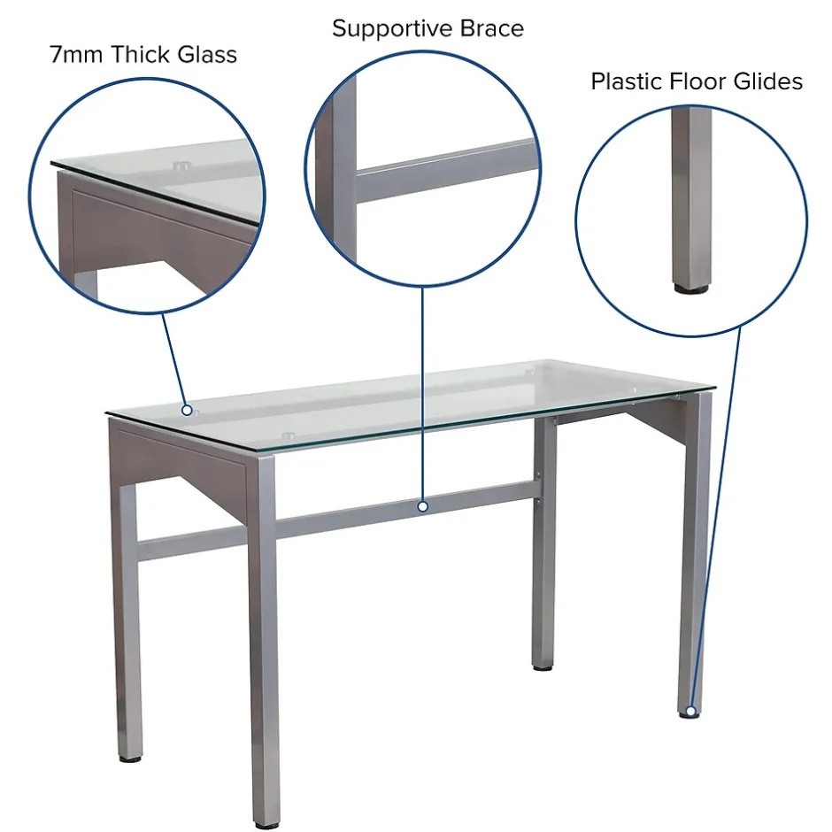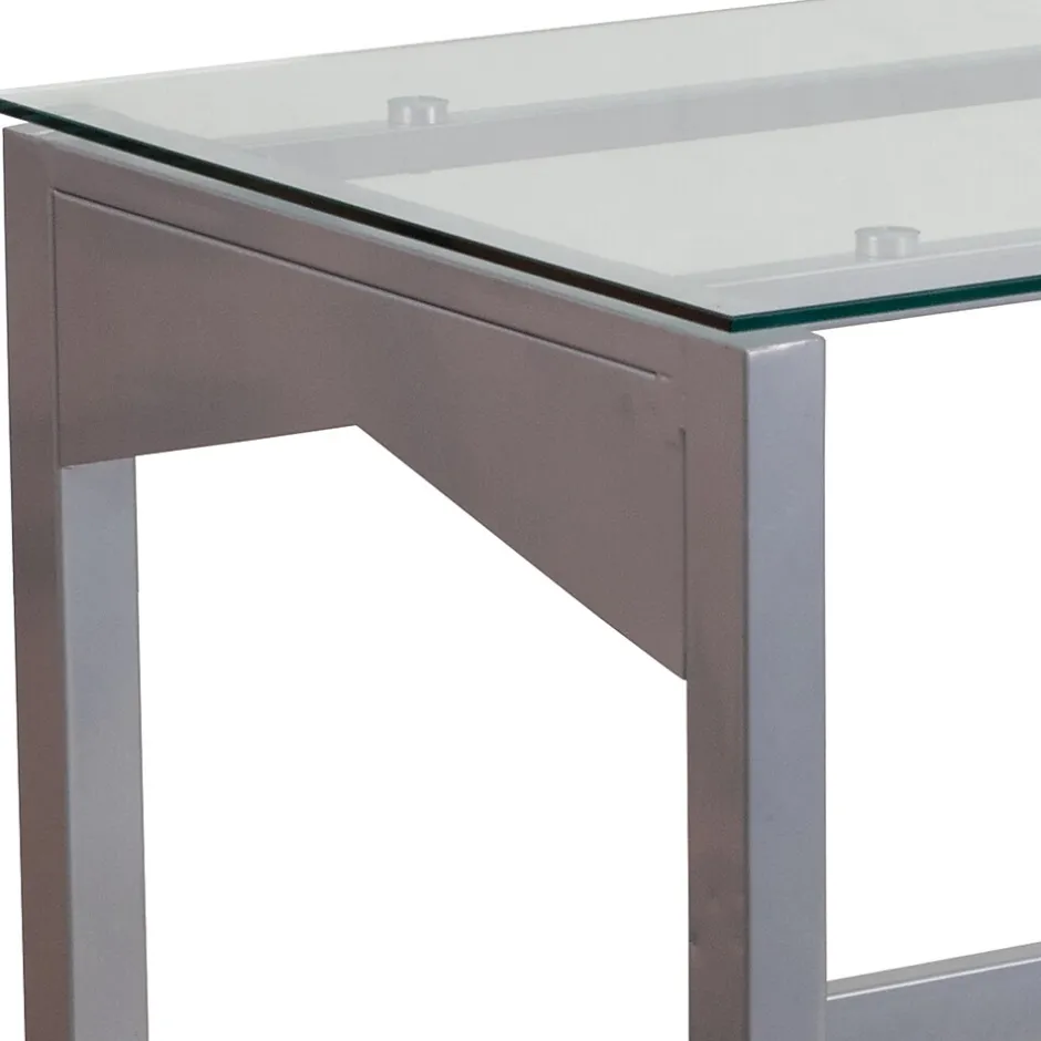 This desk features a clear, tempered glass surface supported by an industrial style, silver powder coated frame with geometric accents on the sides. The generously sized desktop allows you to efficiently manage your workload, while providing ample room for your favorite desk chair. A supportive brace across the rear legs reinforces the frame and complements the stylish lines of the design. Plastic floor glides protect your floors by sliding smoothly when you need to move the desk.