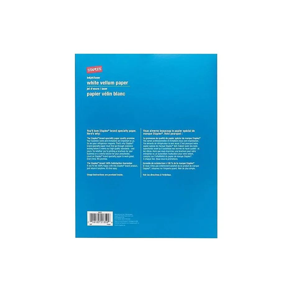 Give invitations, presentations, and event programs an elegant finishing touch with this Staples multipurpose white vellum paper. The translucent design lets pages beneath peak through, and the letter-size sheets work with an array of printing formats. With 50 sheets in each pack, this Staples multipurpose printer white vellum paper makes it easy to create stacks of menus or invites with a single print run.