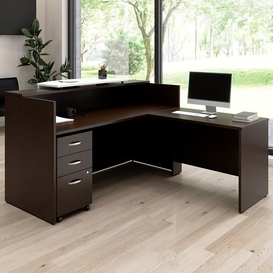 The Bush Business Furniture Arrive 72W x 72D L Shaped Reception Desk with Counter and Mobile File Cabinet provides a stylish and practical solution for welcoming guests to your office’s waiting room. Greet visitors at a front desk that includes a raised shelf for signing in and completing paperwork. The durable thermally fused laminate surface protects against scratches and stains while a 200-pound weight capacity and built-in wire management grommets accommodate multiple monitors and other equipment. The rolling file cabinet features one drawer for letter, legal, and A4-size paperwork as well as two drawers for small office supplies. This commercial-grade receptionist desk with drawers has been meticulously tested to meet or exceed ANSI/BIFMA standards for safety, durability, and performance and is backed by a 10 Year Manufacturer’s Warranty. American made with U.S. and imported parts.