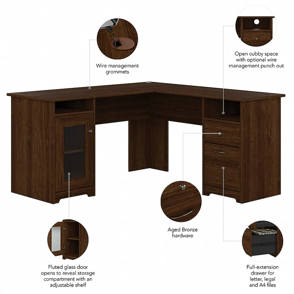 The Bush Furniture Cabot 60W L Shaped Computer Desk offers a spacious and efficient workspace for your home office. Enjoy a beautiful traditional look with smart features for your convenience. The L Shaped Desk design provides a large, durable work surface and just the right amount of storage to keep you feeling neat and organized. Storage details include an enclosed cabinet with a stylish fluted glass door and a box drawer for supplies. A file drawer opens on smooth full-extension ball bearing slides for an effortless reach to letter, legal or A4 sized paperwork. A built-in 4-port USB hub keeps your devices connected. The corner desk design saves space but provides you with 60 inches to spread out in either direction. This home office desk with storage is tested to meet ANSI/BIFMA standards for safety and performance and is backed by the Bush Furniture 1 Year Manufacturer’s Warranty.