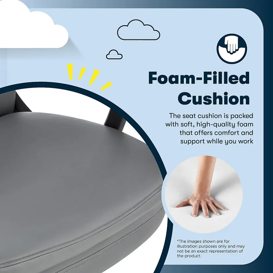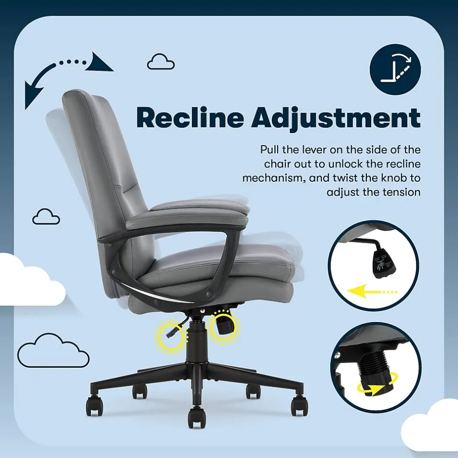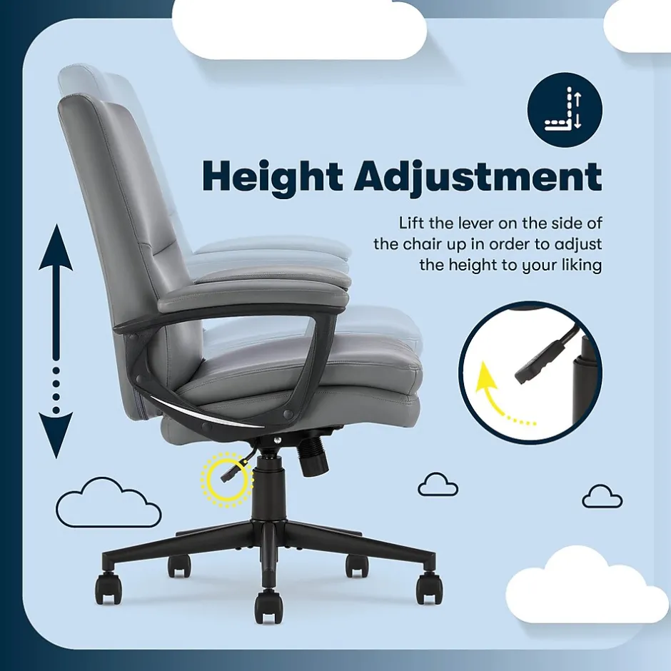 The better you sit, the better you’ll feel. Whether for work, play, or any other activity that has you sitting in our chairs, we believe comfort is everything. We know it’s a big responsibility and take it seriously, just as we do with our mattresses. With over 15 years of making chairs and innovating with designs, materials, and technology, Serta knows what it takes to give you a comfortable sit. Unwind, recharge, and conquer your workday with the Serta Comfort Modern Executive Office Chair. Featuring plush mid-back support, clean lines, luxurious channel-tufting and sculpted arms, this chair will elevate any space. A semi-plush, double-layer cushion seat with generously padded back and armrests provides ample lumbar support and will help you maintain a positive ergonomic posture while surrounding you in comfort. Thick non-recycled Serta quality foam is upholstered in a soft to touch breathable bonded leather to keep you cool during extended sitting times. Available in Black, Brown, Gray, or Cognac with matte black components. A 360º swivel metal base gives you mobility throughout the day and handles weight up to 275 lbs. Plus, the double-wheel casters ensure smooth gliding over rugs and carpet floors so you can scoot around your workspace with ease. Finding your ideal seated position is a breeze with the convenient seat-side lever. Simply adjust the height to perfectly match your stature and desk setup for a personalized fit. A perfect workday companion that adapts to your needs, the Serta Comfort Modern is made for productivity and well-being whether you’re tackling the day from a corner office or at home in the bedroom.