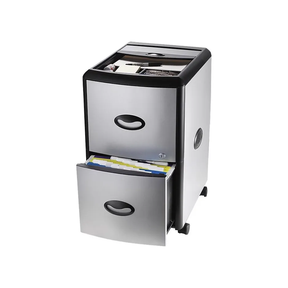Expand your desk setup with this mobile file cabinet. Two spacious drawers offer storage for letter-size file folders, keeping important paperwork within arm’s reach. The handy organizer top provides a place to stash pens, pencils and other small accessories, while the rolling casters ensure easy movement. This Storex file cabinet locks to provide added security for the contents within.