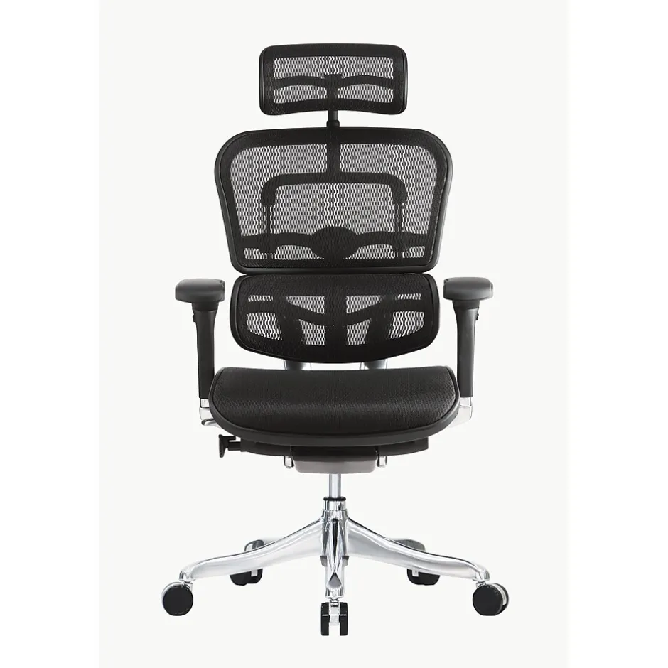 Take your office furnishings high-tech with this Raynor Ergo Elite mesh high-back executive chair. The open design and breathable mesh construction work together to keep you cool, and the sleek, sculpted design brings modern style to your office. A tilt tension knob lets you recline back in the seat, while an integrated headrest provides added support for your neck, shoulders and head. With a contoured waterfall seat design, this office chair relieves pressure points and promotes better circulation. With five-position back angle tilt lock and height-adjustable arms, this Raynor Ergo Elite mesh high-back executive chair makes it easy to create a customized seating configuration.