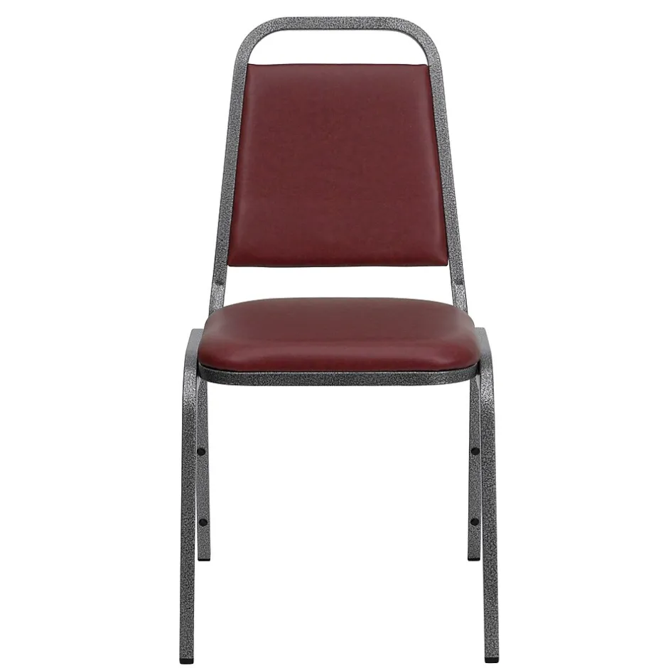 Flash Furniture HERCULES™ Series trapezoidal back banquet chair is sold as 4 per pack are constructed from 16 ga steel frame. Burgundy vinyl upholstered seat with silver vein finished frame offers good comfort and style.