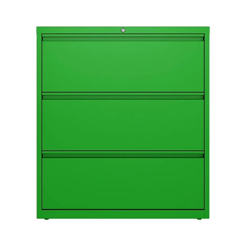 - Three-drawer lateral file cabinet holds letter-, legal-, or A4 size documents