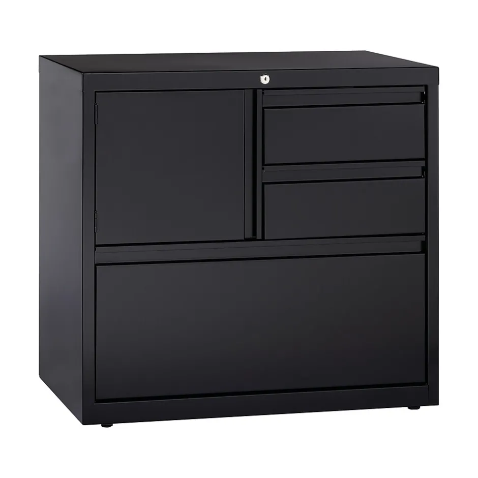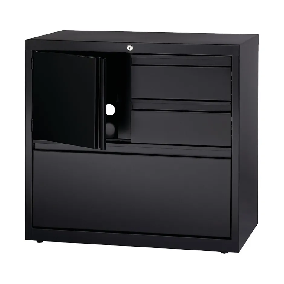 This Personal Storage Center offers versatile storage options with a personal storage compartment, two box drawers and a lateral file drawer. File drawer includes hanging file rails for side-to-side filing in letter or legal-size. Storage compartment includes a grommet for cable management. All three drawers and compartment lock with a core-removable lock to keep your personal items safe. The full-width drawer pull design adds to the clean line of this cabinet while the powder coat finish offers an attractive durable look that complements any decor. Precision ball-bearing suspension provides smooth, quiet drawer performance. Use the included magnetic label holders for easy identification of drawer contents. Interlock system prohibits opening more than one drawer at a time while counterweight prevents tipping. A reinforced base construction and four adjustable leveling glides work to stabilize it on uneven surfaces. Greenguard Gold certified for indoor air quality. Meets or exceeds ANSI-BIFMA standards. TAA compliant. Limited Lifetime Warranty.