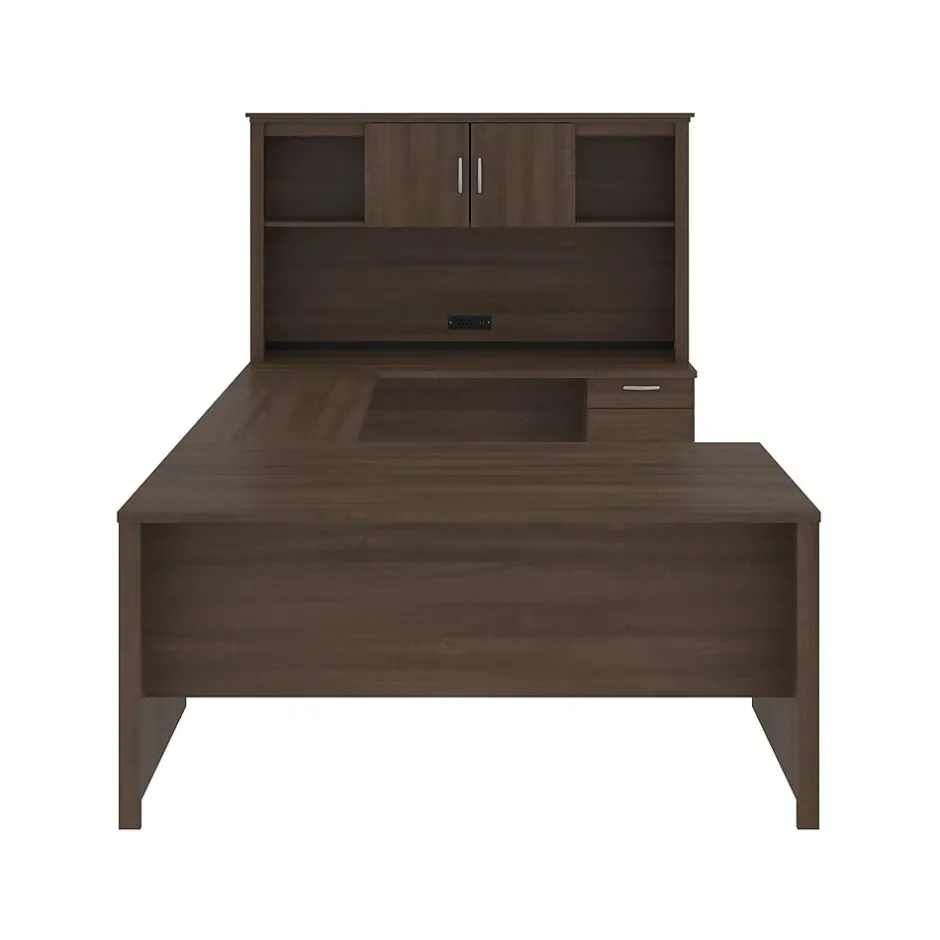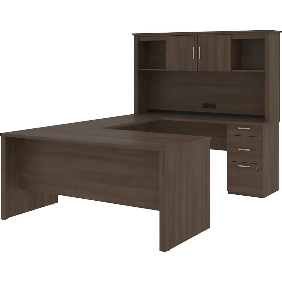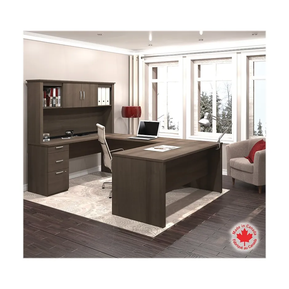 The work surface provides sturdiness and durability while the elegant moldings bring style and sophistication to any office space. This versatile executive desk can be set up as a U-shaped desk or as two desks to meet the demands of the ever-changing workplace. The utility drawer and the lockable file drawer are perfect for storing office supplies and sensitive documents. Open and closed storage compartments accommodate items of various sizes. Thanks to the power bar and wire management strip on the hutch, this executive desk meets the requirements of modern work environments with an abundance of technology and electronics.