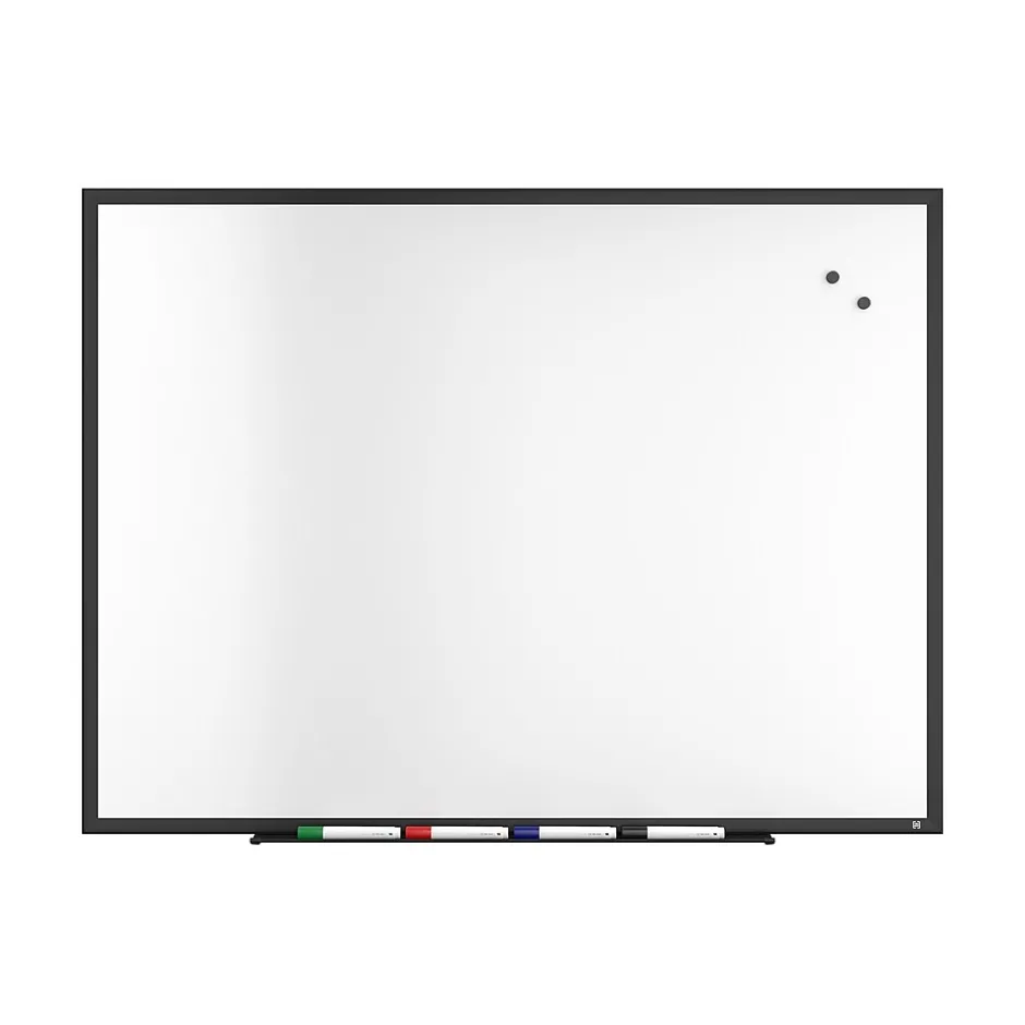 This TRU RED™ whiteboard features a durable, non-porous magnetic porcelain surface that prevents marker ink from penetrating the board and makes cleaning just as easy as writing. The magnetic surface of the board is perfect for brainstorming additions like papers, photos, or designs. The large surface area of the board is easy to care for, perfectly sized for use in the office or the home, with an added versatility that allows vertical or horizontal placement. Clean when necessary but know that those long-term ideas can stay up without worrying about leaving a permanent stain.