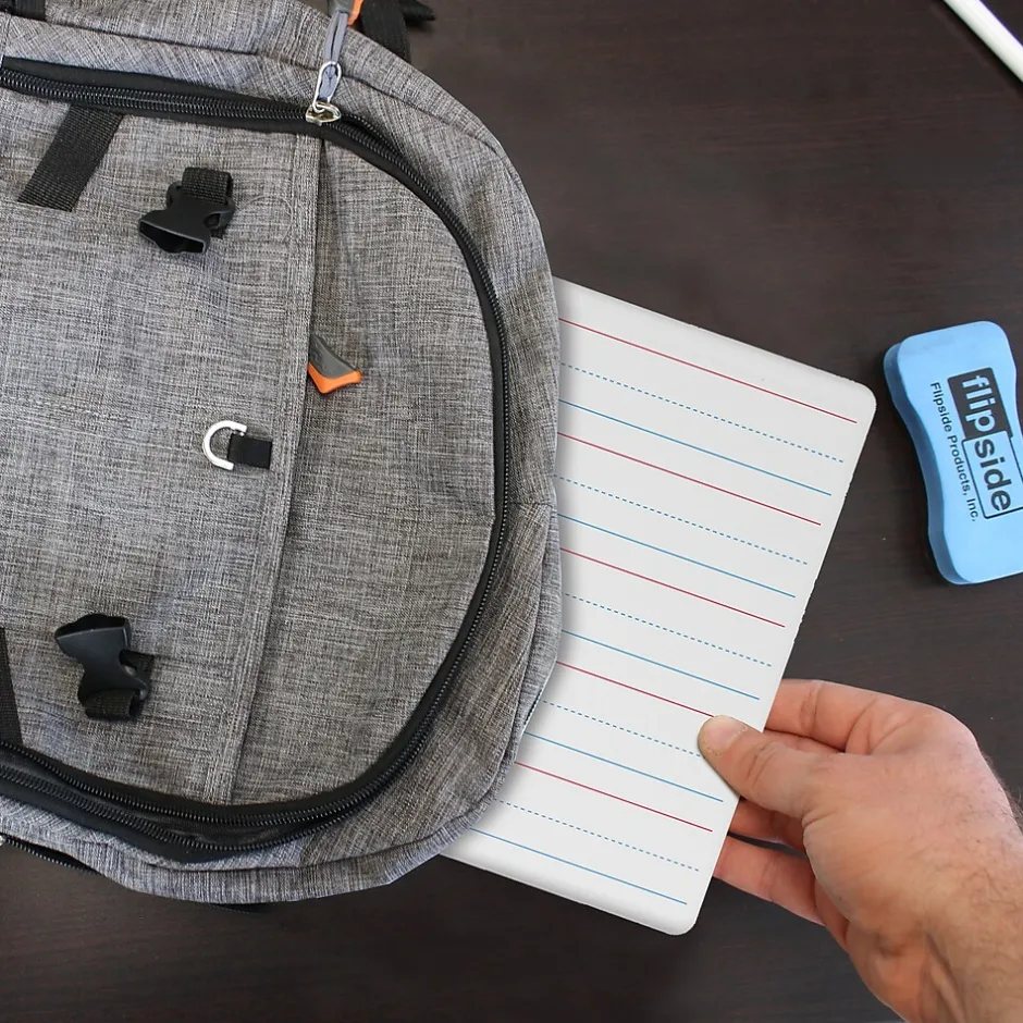 Ideal for teaching and practicing fundamentals at the early learner stage! Each bright white board contains 5 sets of blue headline and broken mid-line plus red baseline format. Each line set measures 1-1/8″ with 3/8″ of blank descender space between sets. Back side is plain white dry erase. Boards feature a non-ghosting dry erase surface with smooth, rounded edges and corners for comfort and safety. Measures 12″ x 9″ x 0.125″ thick. Class pack includes 24 boards.