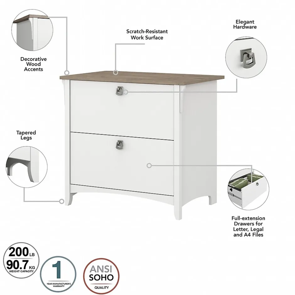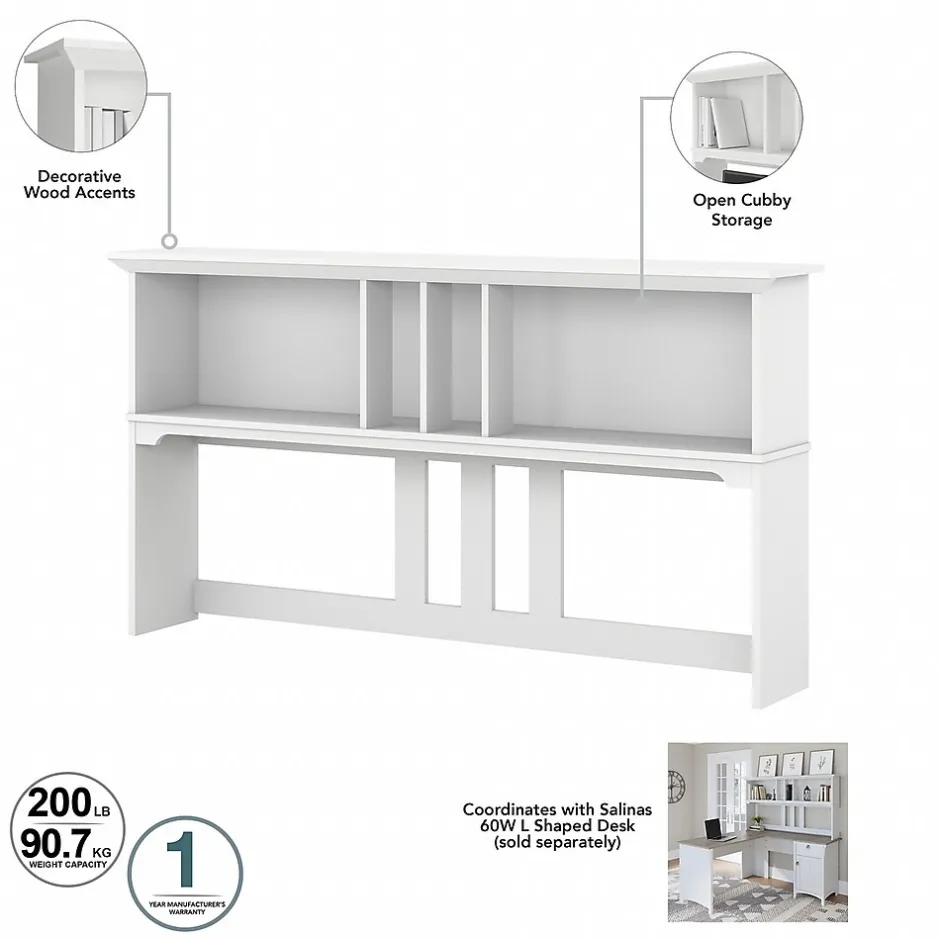The Bush Furniture Salinas 60″W L-shaped desk with hutch, lateral file cabinet, and five-shelf bookcase offers a comprehensive home office solution with casual style. Spread out and multitask on the L-shaped desk’s surface designed to save space by fitting into a corner. Store writing utensils and supplies in the convenient box drawer and keep larger items in a cabinet with an adjustable shelf. The hutch attaches to either side of the computer desk and features two large cubby areas as well as two smaller spaces for storage and display. The two-drawer file cabinet opens on full-extension ball bearing slides for an easy reach to legal- and letter-size documents. A pair of fixed shelves give the bookcase stability while three adjustable shelves accommodate items of various sizes. This corner desk set is tested to meet ANSI/SOHO quality standards for safety and performance.