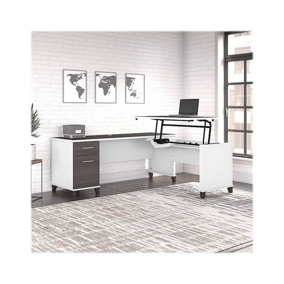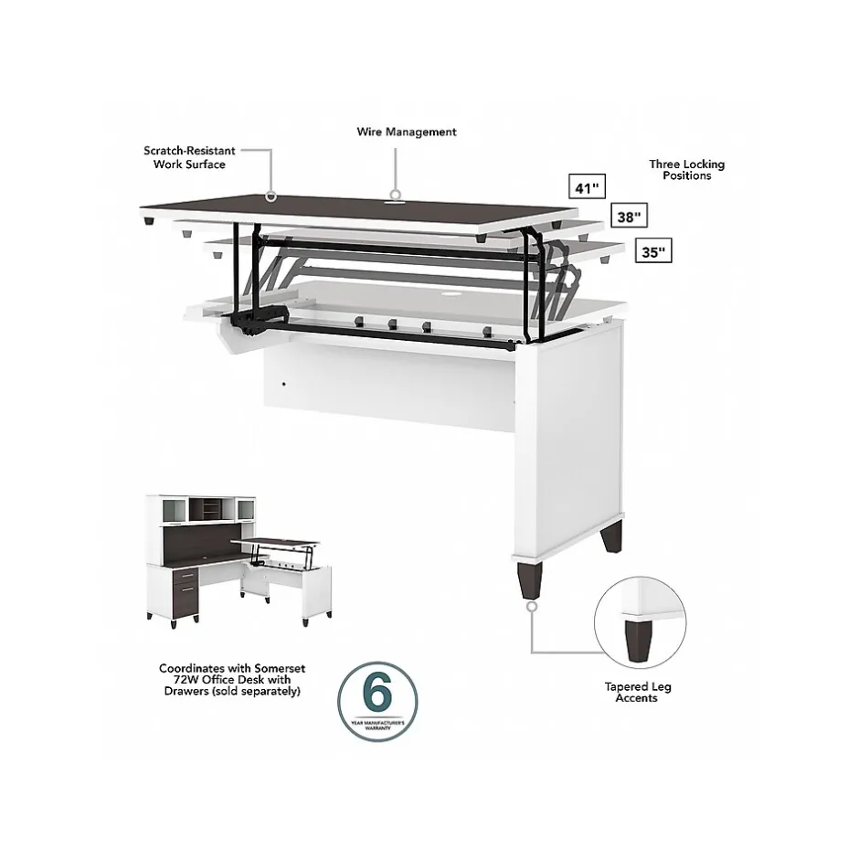Upgrade your personal workspace with the ergonomic Bush Furniture Somerset three-position sit-to-stand L-shaped desk. As a quality alternative to desktop risers, the innovative 42″W x 24″D sit-to-stand return offers all the health benefits of a standing desk with the versatility of more expansive electric height-adjustable options. The built-in mechanical lift-and-lock system allows the desktop to lock into place at standing heights of 35″, 38″, and 41″ and easily returns to a seated position. The office desk includes a file drawer that opens on full-extension ball bearing slides for easy access to legal- and letter-size documents in addition to a box drawer for supplies and utensils. Fixed surfaces are tested to meet ANSI/SOHO standards for safety and performance while the mechanical lift is rigorously tested to Bush Furniture quality standards.