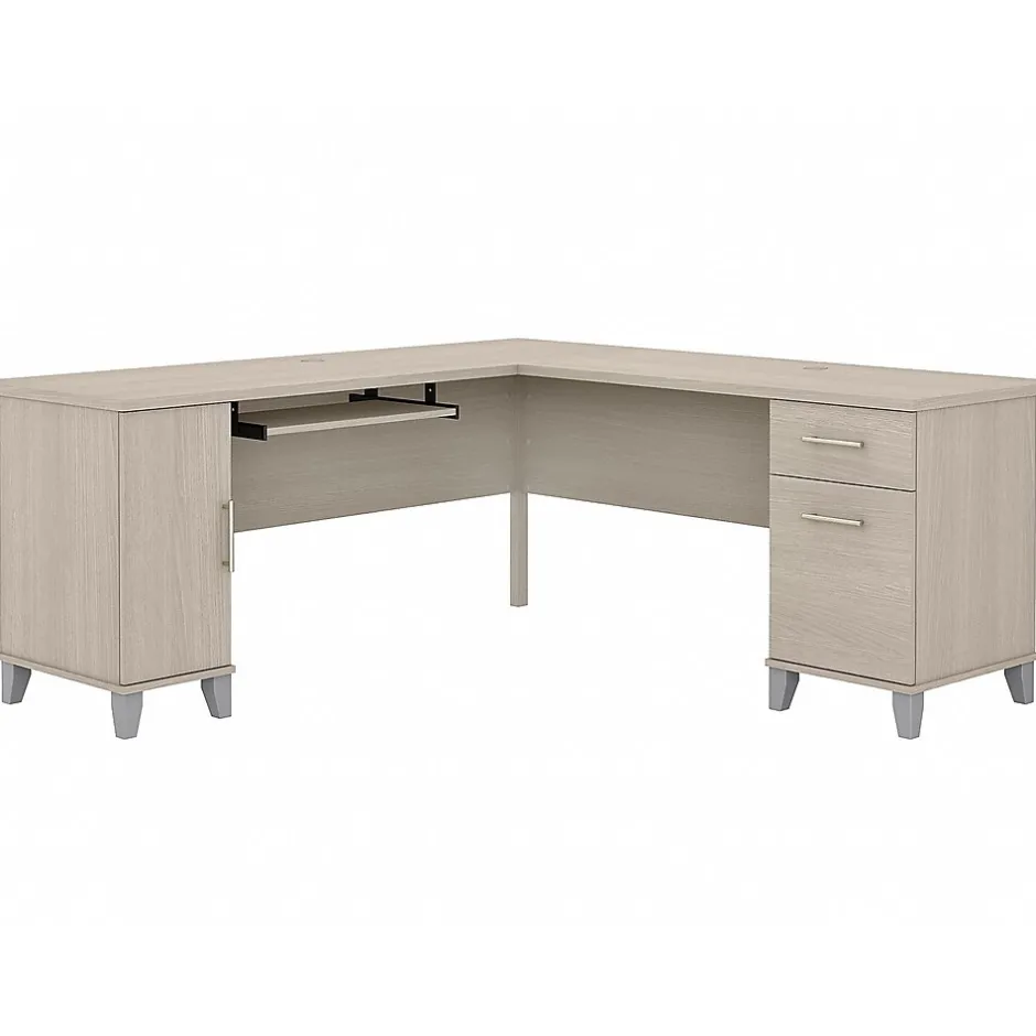 Maximize the potential of your home office with the Bush Furniture Somerset 72″W L-shaped desk. Create your remote work headquarters with space for a computer, phone, printer, and more on a surface that features wire management slots for keeping cords and cables in order. A convenient pull-out shelf provides a perfect place to keep a keyboard or laptop, and the desk also includes a vertical storage cabinet with an adjustable shelf. Place pens, paper, and more in the box drawer, and enjoy a file drawer gliding on smooth ball bearing slides for an easy reach to documents. Transitional styling includes a stylish finish with tapered legs and contemporary metal hardware for an alluring appearance. This desk with storage is tested to meet ANSI/SOHO standards for safety and performance and is backed by the 6-year manufacturer warranty. American-made with US and imported parts.