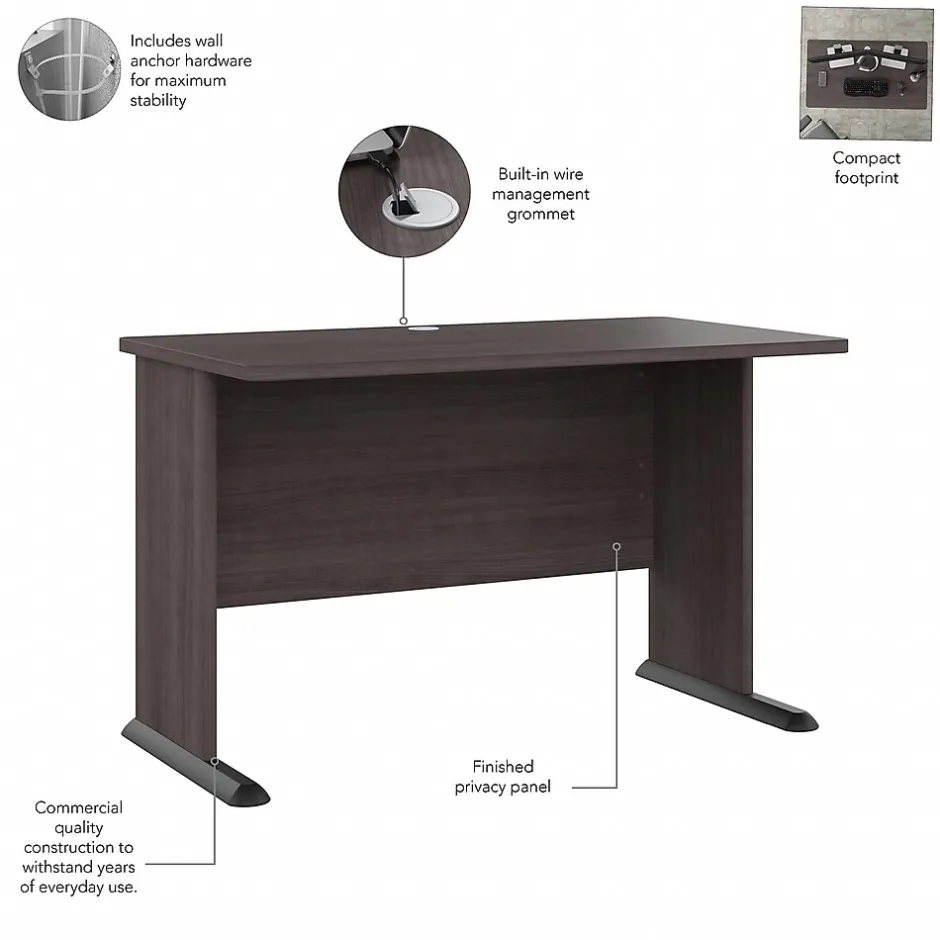 The Bush Business Furniture Studio A 48″W computer desk with three-drawer mobile file cabinet combines a fresh contemporary appearance with the commercial-quality construction needed to withstand years of everyday use. Set up with a computer and equipment on the durable thermally fused laminate desktop that supports up to 200 lbs. A built-in wire management grommet keeps cords and cables in order, so the surface remains free from unnecessary clutter. The file cabinet’s bottom drawer accepts letter-, legal-, and A4-size paperwork, while two box drawers organize supplies. The two bottom drawers can be locked to protect sensitive files and personal items. This small desk with drawers has been meticulously tested to meet or exceed the ANSI/BIFMA standards for safety, durability, and performance and is backed by a 10-year manufacturer limited warranty. American-made with US and imported parts.