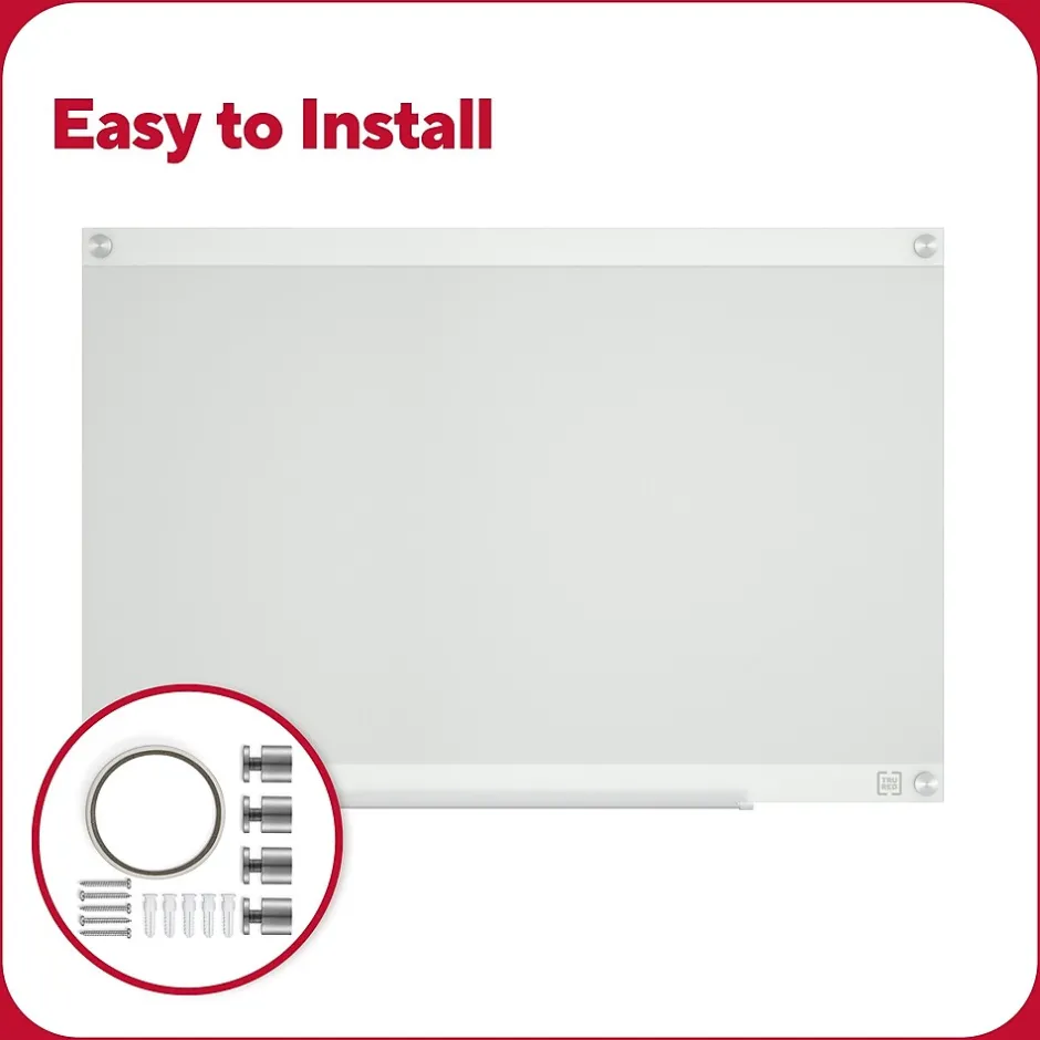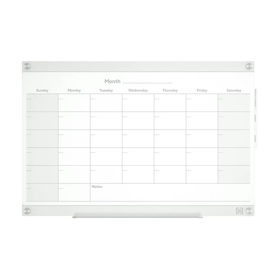 Manage schedules or deliverables, run brainstorms and collaborate or keep your team organized with three, durable double-sided templates. Easy-pull tabs make it easy to swap between templates. The rear template storage compartment allows for easy access to templates and convenience. This TRU RED™ Templated Glass Board is intended for heavy use, so it can be used with hospital grade disinfectants and it won’t stain. Additionally, the magnetic backboard allows users to attach documents or visual aids, helping to improve workflow and productivity.