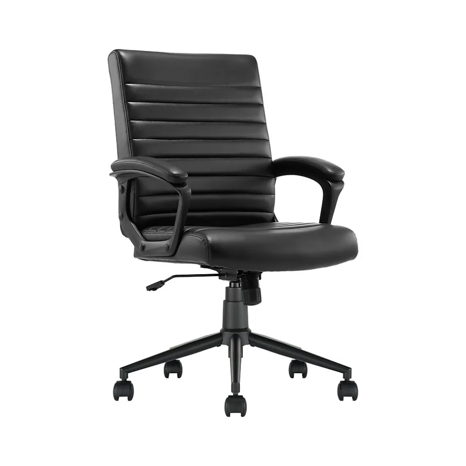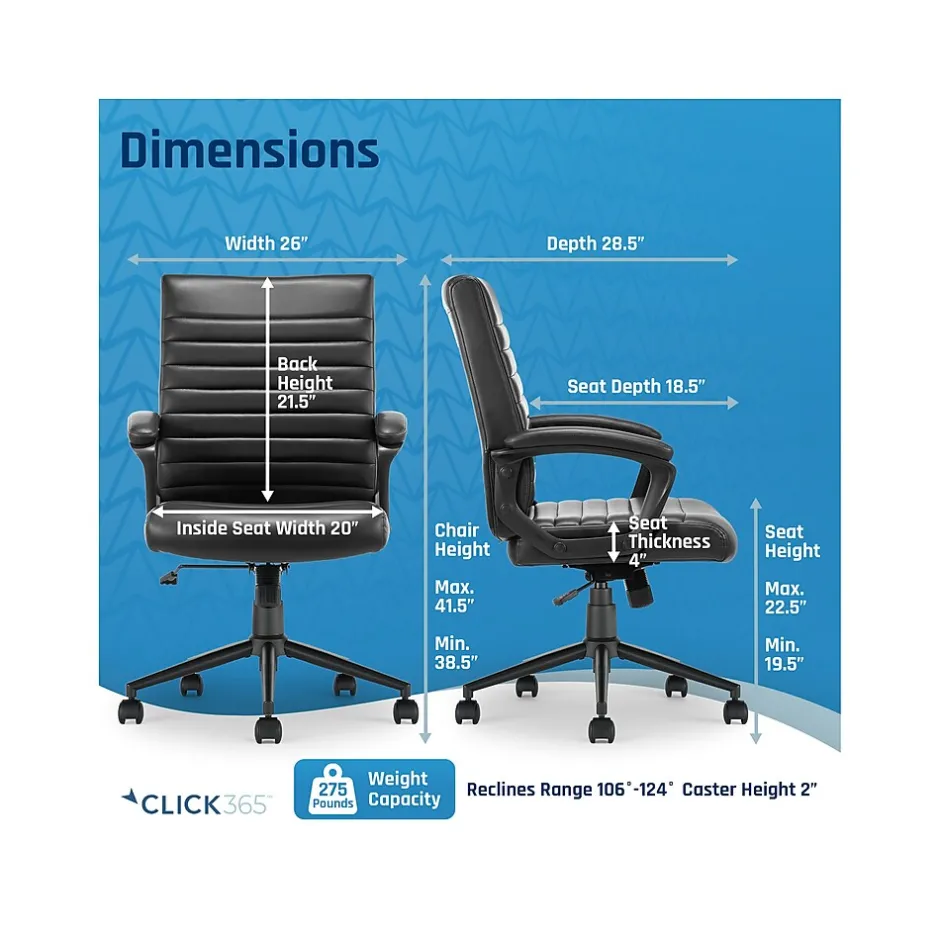 Bring relaxation to your busy workday with the Click365 Transform 3.0 ergonomic mid-back desk chair, which delivers American comfort with ultra plush padding in the headrest, back rest, and seat cushion. This chair has a 5″ thick contoured seat cushion and reliable ergonomic support, providing long-lasting comfort, and is perfect for everyday use at home and in the office. Pneumatic adjustable height, swivel base design, and quality smooth-rolling casters ensure this office chair is easy to move and position. The chair is upholstered in premium durable bonded leather over high-density foam and boasts a heavy-duty metal base and sophisticated stitching. You can purchase this chair with confidence.
