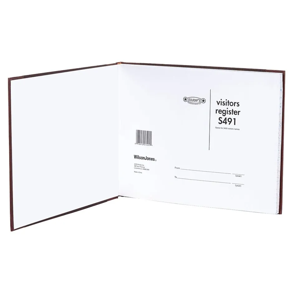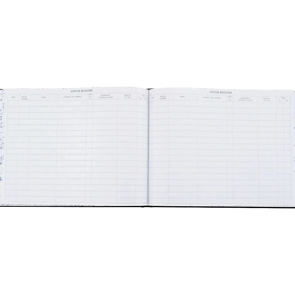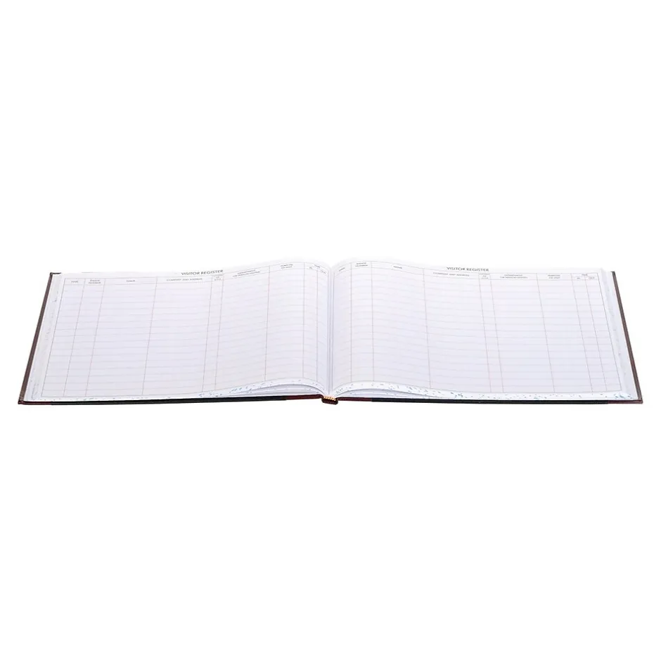 Provide an accurate list of visitors using this log book, which has space for 3,400 entries. The black cover with brown trim and gold foil stamps is durable and stylish, and the 208 pages have columns that include the date, name, time in/out, company/address, and purpose of visit. This Wilson Jones register book is ideal for security purposes and useful during emergency evacuations.