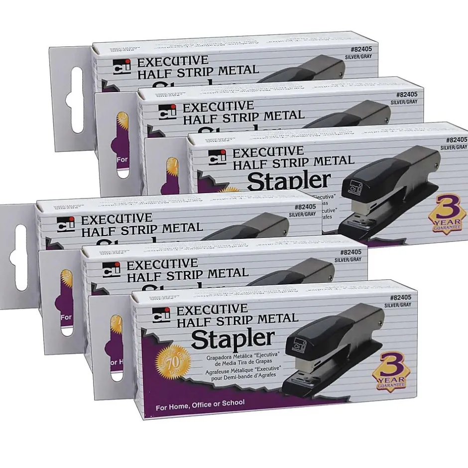 This stapler features a modern design for the office professional. Durable metal construction with non-skid base. Jam resistant mechanism; open channel loading. Rotating anvil for stapling or pinning, also tacks. Uses standard 0.25″ staples, half strip. Pack of 6 staplers.