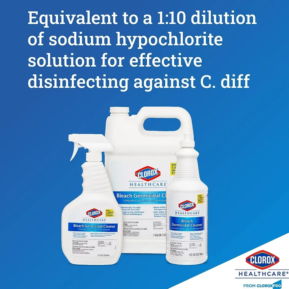 Healthcare professionals trust Clorox Healthcare® Bleach Germicidal Cleaner to help them overcome infection control challenges in a constantly changing healthcare environment. Clorox Healthcare® Bleach Germicidal Cleaner is a ready to use, 1 step cleaner- disinfectant containing a 1:10 bleach dilution to meet CDC and OSHA guidelines for disinfecting surfaces in healthcare settings. This cleaner disinfectant is EPA registered to kill a total of 50 microorganisms, including HAI causing bacteria like MRSA and VRE, outbreak causing viruses such as Influenza A and B viruses, Measles Virus and Norovirus and fungi in 1 minute. This disinfectant kills 99.9999% of C. difficile (C. diff) spores in 3 minutes, according to the current EPA recommended testing standard (June 2014). In addition, this cleaner meets EPA criteria for use against SARS-CoV-2, the virus that causes COVID-19. The ready-to-use disinfectant eliminates compliance risks and labor costs associated with dilutable disinfectants. Designed for easy refilling to meet needs of heavy users. This bleach solution features an anticorrosion agent and is formulated for broad surface compatibility with healthcare surfaces including stainless steel, glass, plastic, porcelain, glazed ceramic, laminated surfaces and vinyl. Intended for use in Healthcare settings.