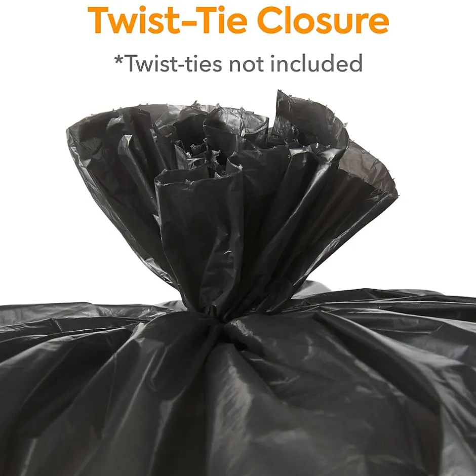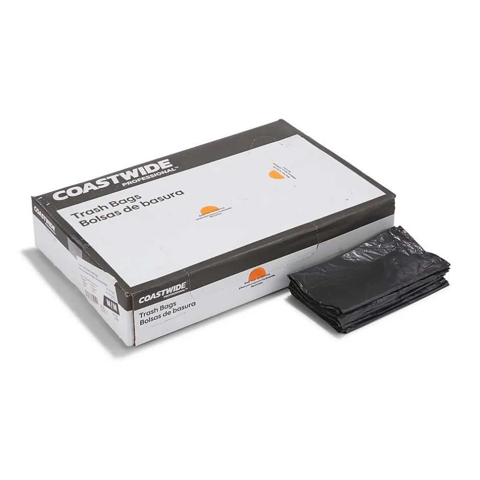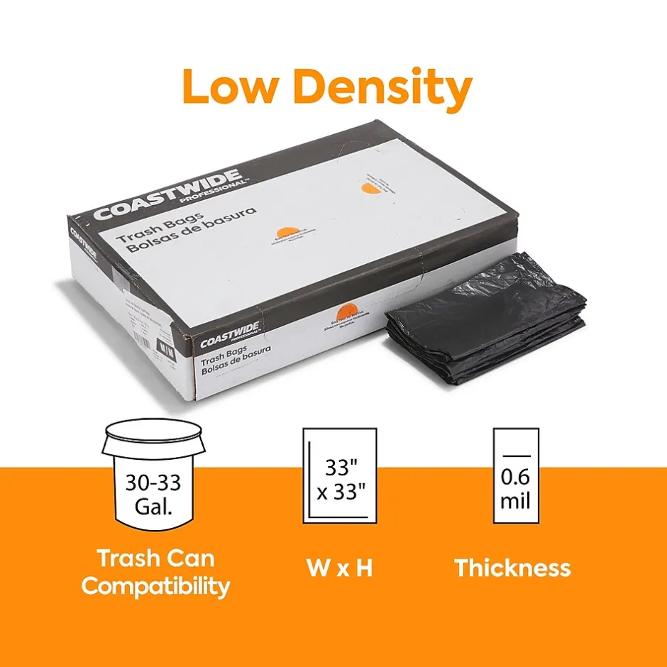 Take care of bulky refuse with these heavy-strength trash bags. The opaque black color keeps the contents hidden from sight to ensure discretion, while the low-density plastic resists stretching to avoid leaks and spills. With a 30 to 33-gallon capacity, these star-sealed Coastwide Professional™ 0.6-mil trash bags provide ample space for garbage, and the 250-count carton meets the demands of busy environments.