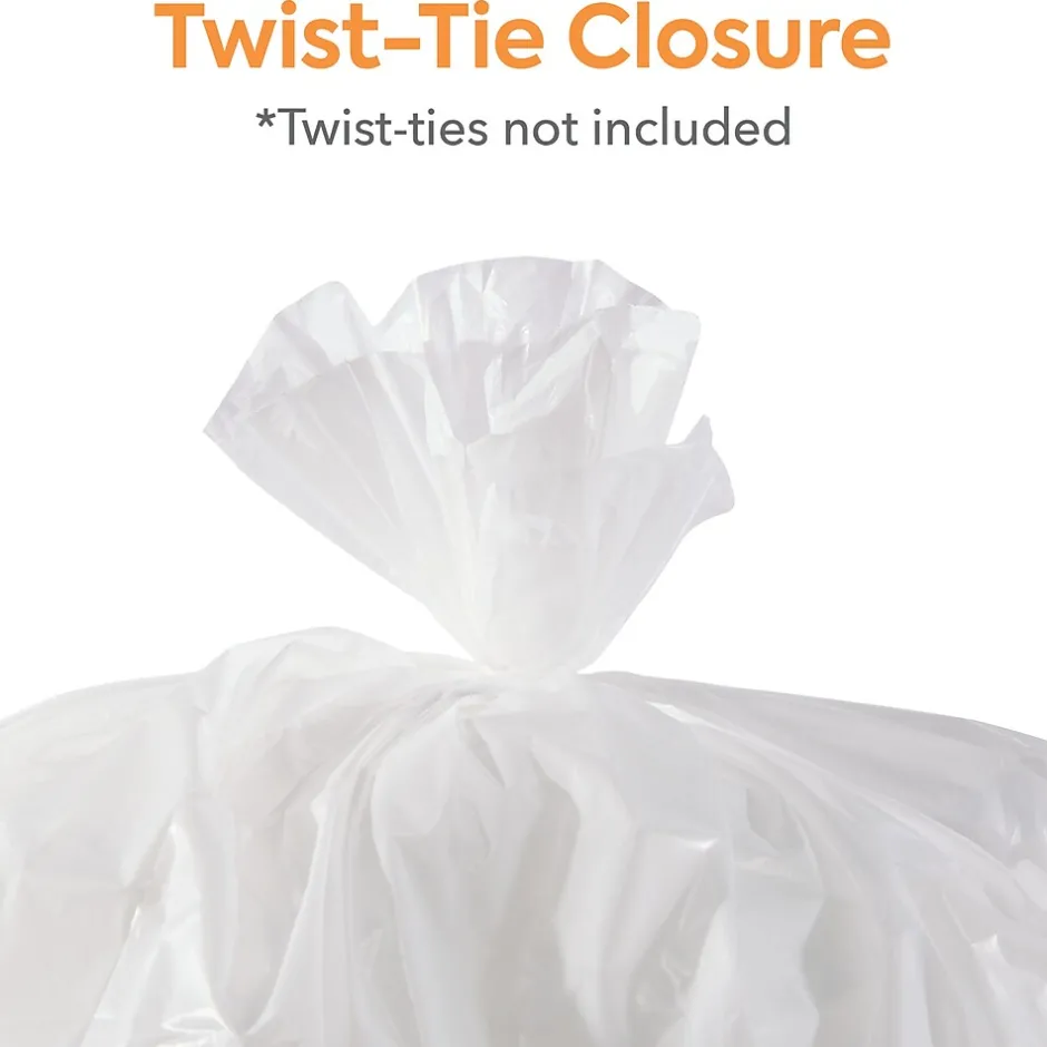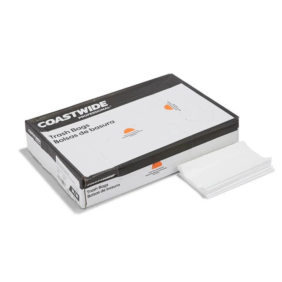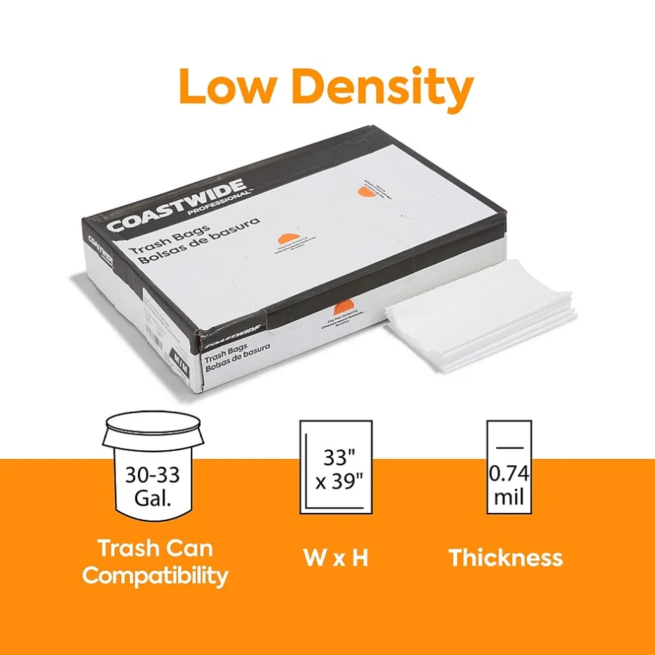 Remove garbage from your office safely with these white trash bags. The low-density polyethylene prevents heavy objects from stretching holes, and the star-sealed bottom distributes weight evenly to avoid leaks, making them suitable for restrooms and breakrooms. These 0.74-mil thick Coastwide Professional™ white trash bags hold 30 to 33 gallons of waste and feature non-petroleum additives to enhance durability for reliable waste handling.