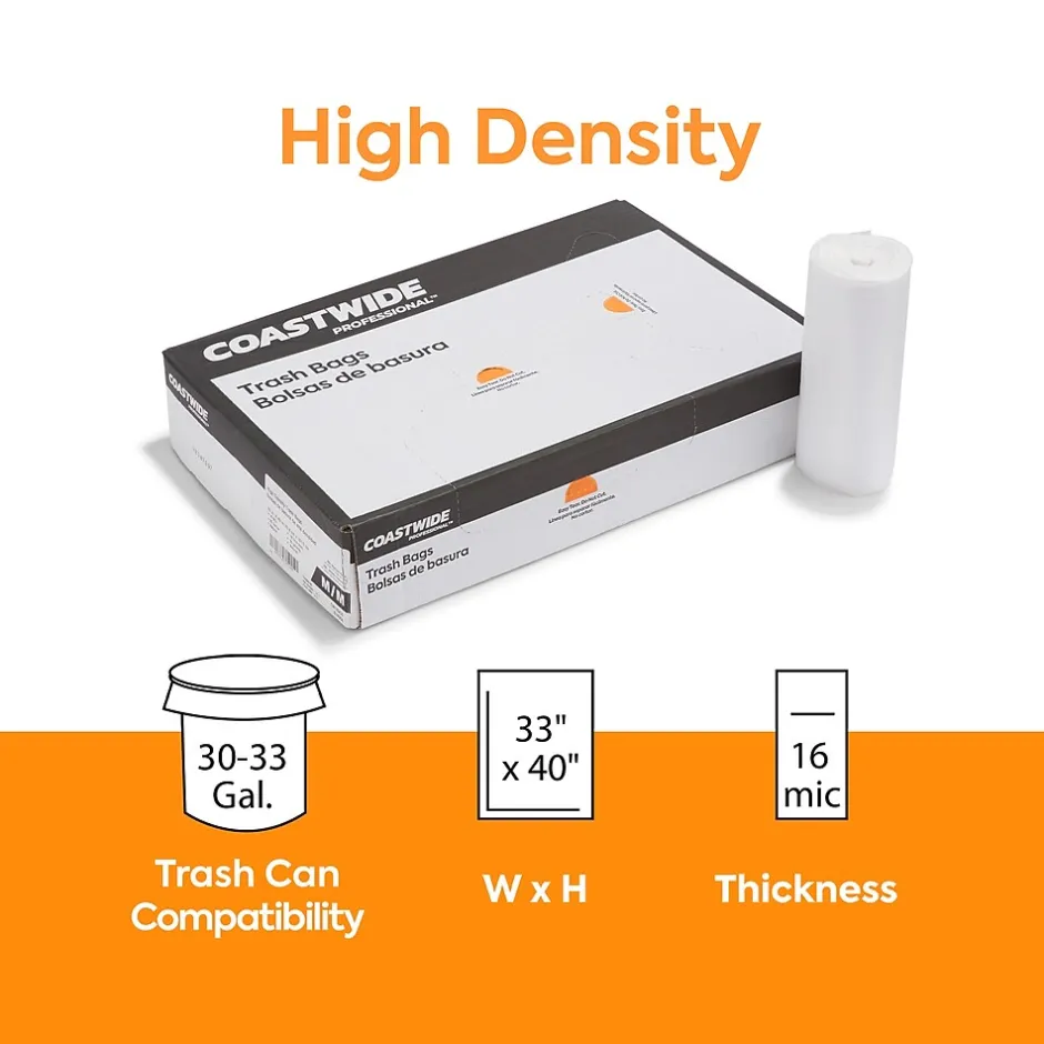 Make disposing of waste easier with these trash bags. The high-density construction offers impressive lifting strength, which is ideal for throwing away heavy or wet items. The natural material lets you inspect contents to help prevent theft and accidental disposal. These Coastwide Professional™ high-density trash bags fit easily in most medium to large trash receptacles for quick maintenance.