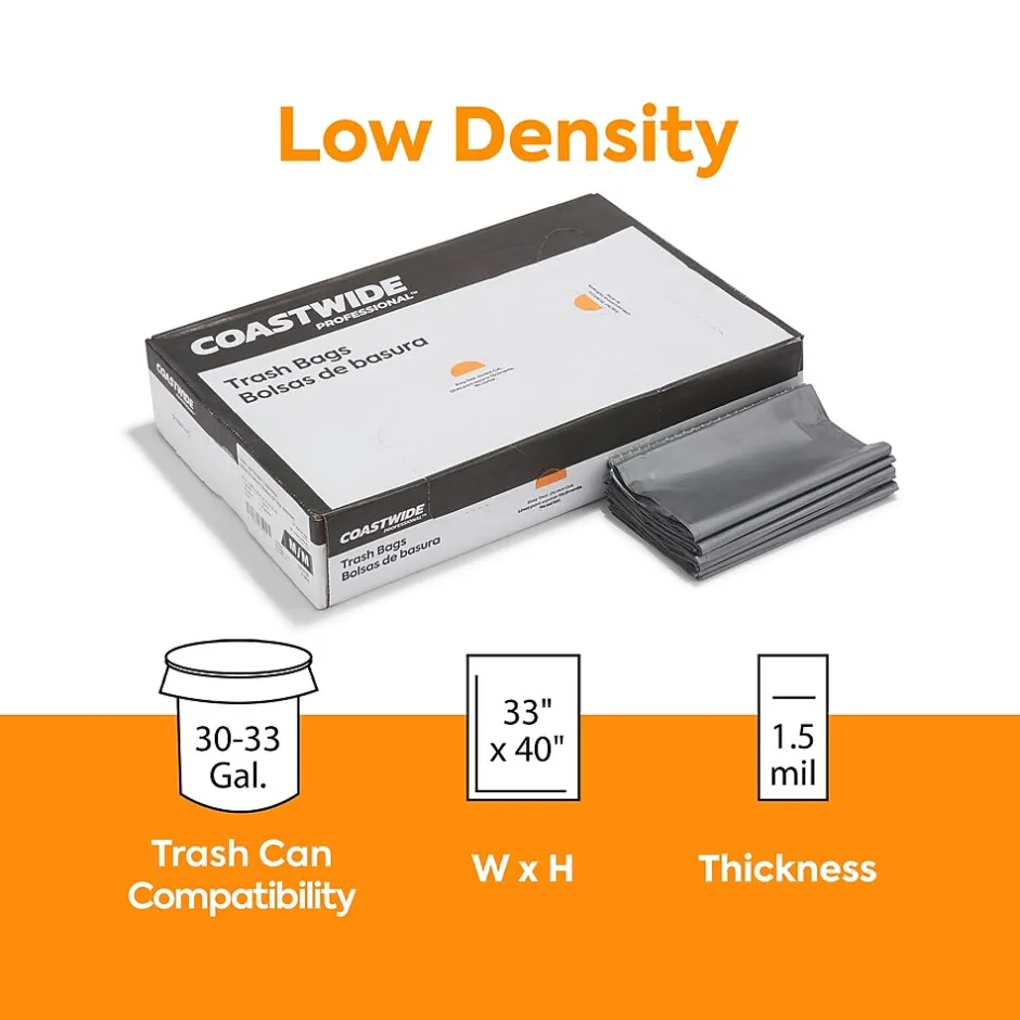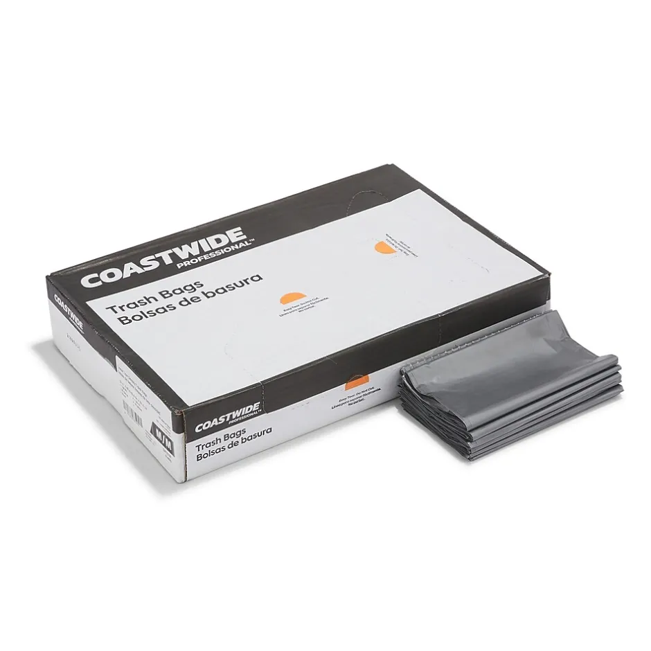 Stay on top of your office waste with these gray trash bags. The star-sealed bottom distributes weight evenly to reduce the risk of tears and leaks, while the super heavy-strength linear low-density polyethylene resists puncturing from sharp objects, making them suitable for cafeterias and institutional use. These 30 to 33-gallon Coastwide Professional™ trash bags come in a carton of 100, ensuring an ample supply for your cleaning closet.