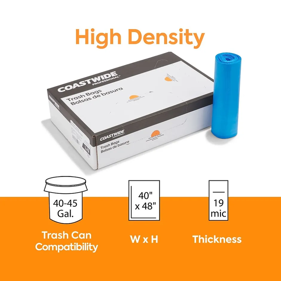 Stock a supply of these liner trash bags to keep your space organized. The 40 to 45-gallon capacity helps you avoid overfilling, keeping your workspace mess-free, while the high-density polyethylene provides good lifting strength. These blue Coastwide Professional™ liner trash bags come in a carton of 200 to meet the demands of big organizations, and the 0.74-mil thickness ensures durability.
