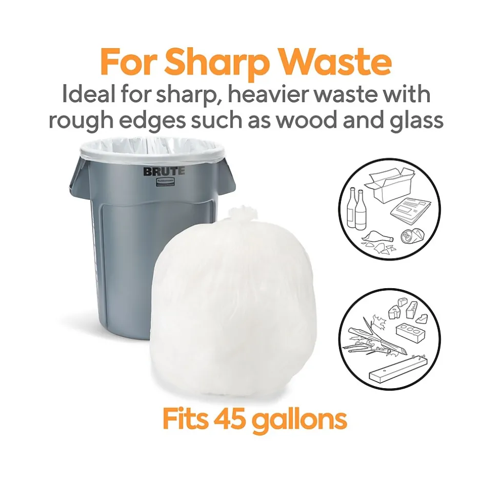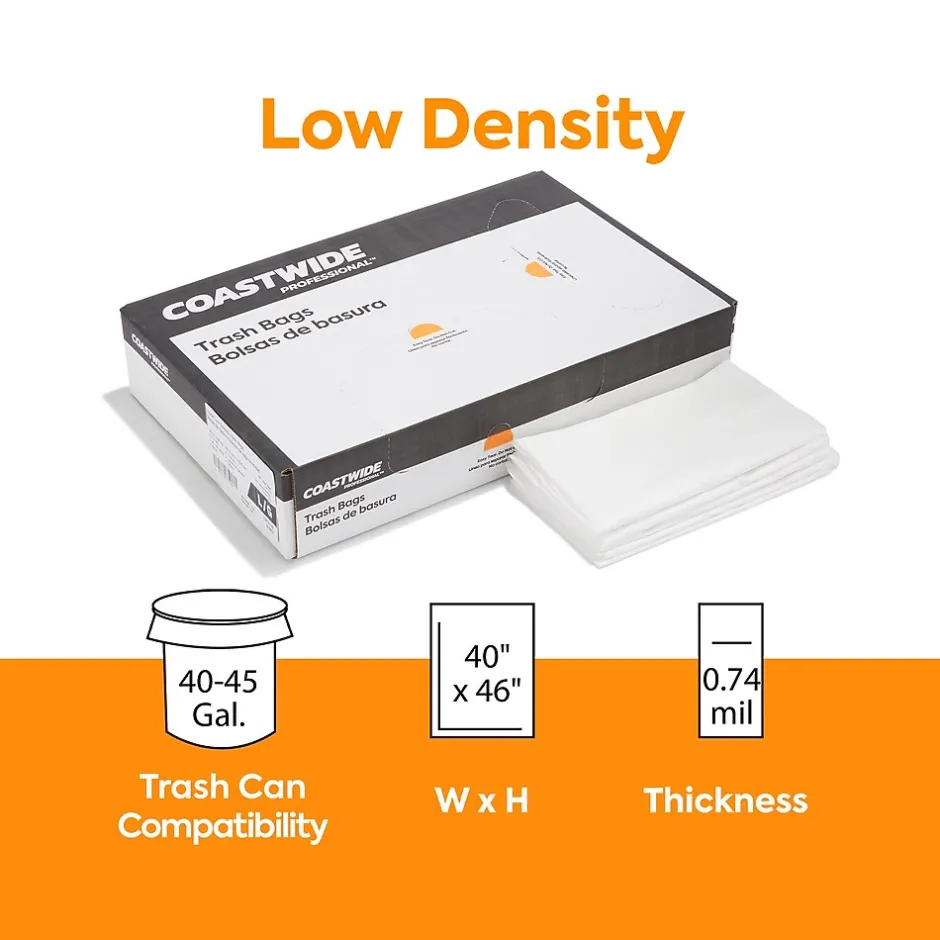 Keep your office clean with these trash bags. The 40 to 45-gallon size holds plenty of waste and fits in a variety of trash cans, and the low-density polyethylene construction resists tearing and stretching when containing heavy items. These white Coastwide Professional™ 40 to 45-gallon low-density trash bags have star-sealed bottoms that improve weight distribution and help prevent leaks.