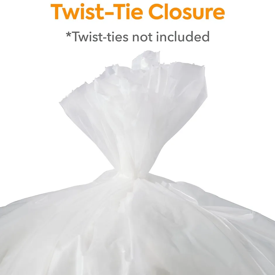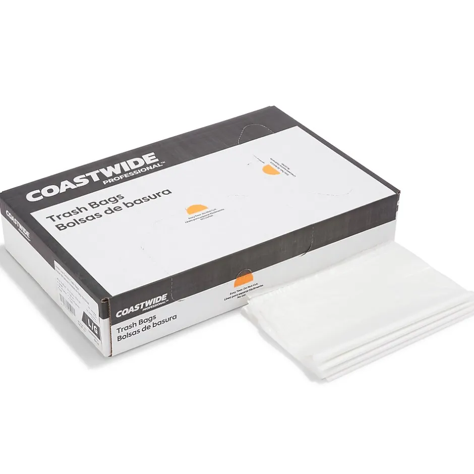 Take out garbage easily with these heavy-duty trash bags. The low-density plastic prevents heavy objects from stretching the material to reduce the risk of breakage, while the 40 to 45-gallon capacity provides ample space for trash. These Coastwide Professional™ trash bags are clear to give a view of the contents, helping avoid theft, and the 1.5-mil thickness resists ripping for durability during use.