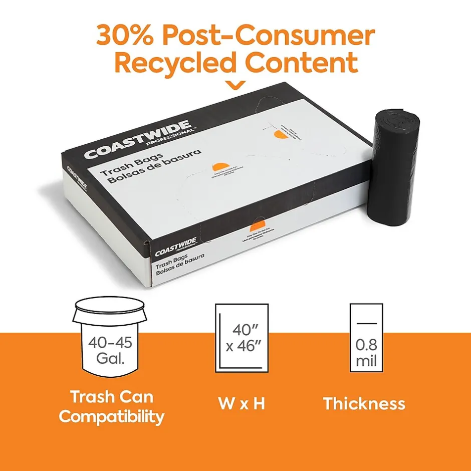 Reduce waste and clean heavy messes with trash bags made from 30% post-consumer recycled content. Capable of handling up to 45 gallons of waste, these Coastwide Professional™ 30% PCR Trash Bags are low-density, making them tear-resistant and able to contain sharp or rough materials.Make stocking up on essentials simple and more eco-friendly with this box of 150 durable garbage bags that will fit large trash cans.