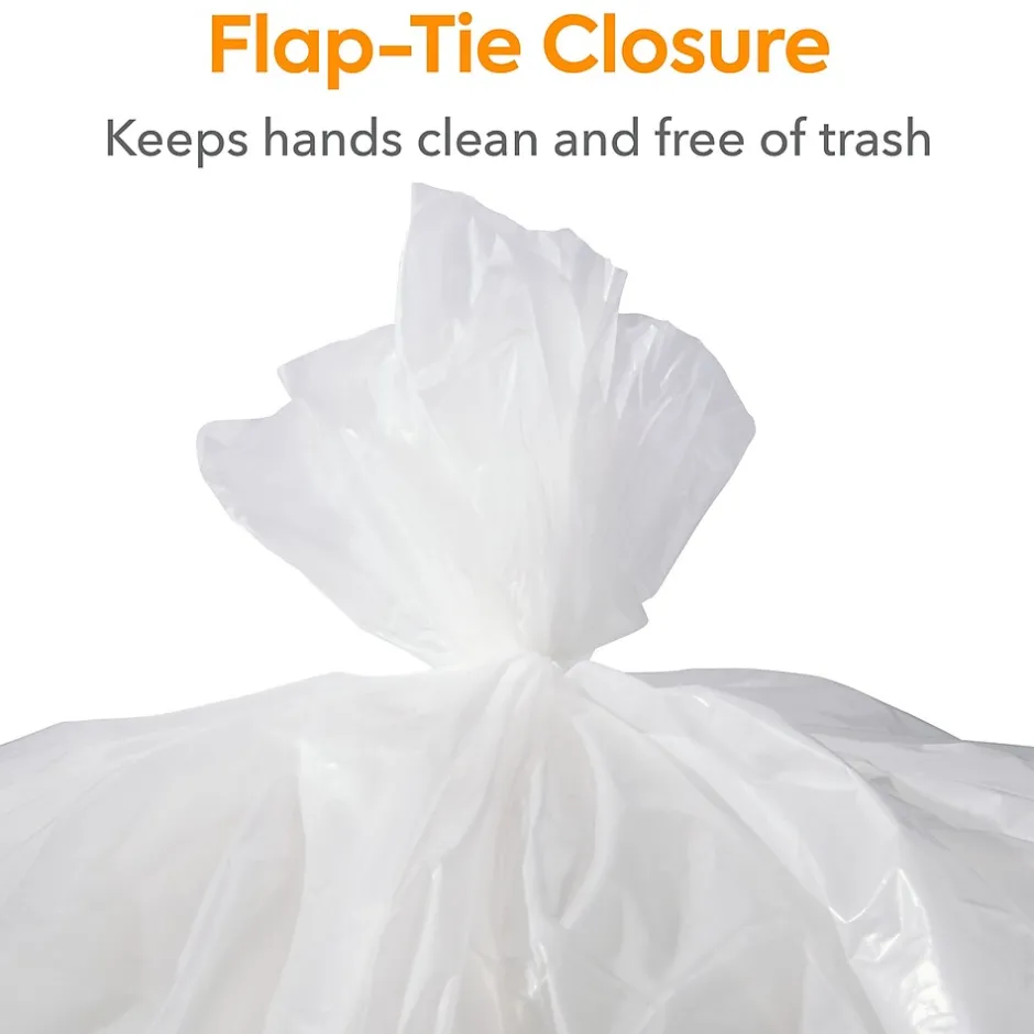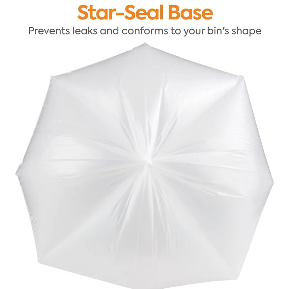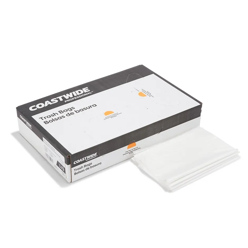 Monitor waste levels quickly with these clear industrial-purpose trash bags. The 1.1-mil strength withstands regular general-purpose use, while the flat pack container easily releases one bag at a time. These Coastwide Professional™ 50 to 56-gallon clear low-density trash bags are unscented for increased comfort, and the star-seal design helps prevent leaks and supports storage of wet garbage.