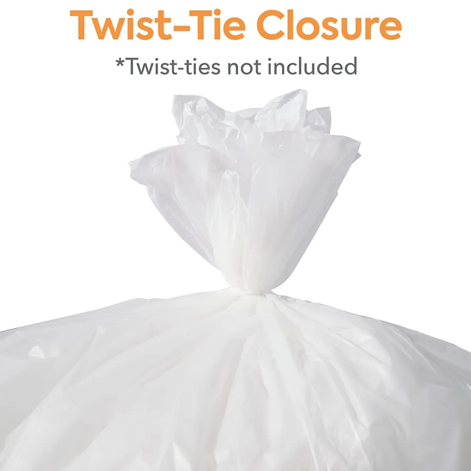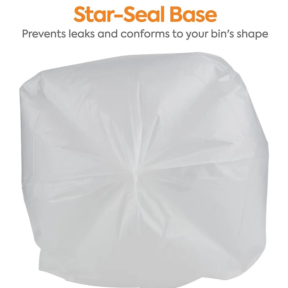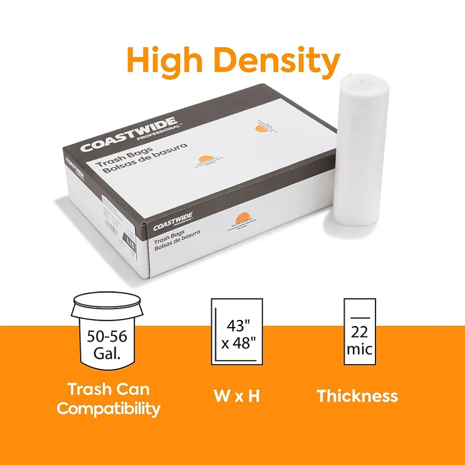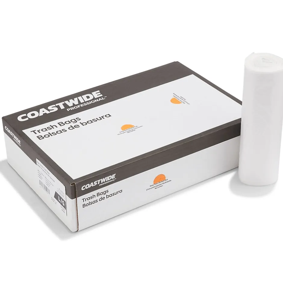 Keep offices and public spaces clear of refuse with these natural trash bags. The star-sealed bottoms help prevent leakage, which is perfect for removing wet trash from breakrooms and commercial spaces. Each carrier holds up to 56 gallons to easily handle large disposal tasks, while the translucent material provides content-viewing without manually rummaging through. With 150 items per carton, these Coastwide Professional™ trash bags are ideal for businesses that go through lots of waste.