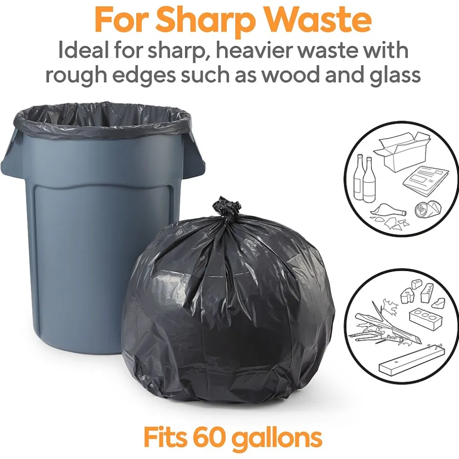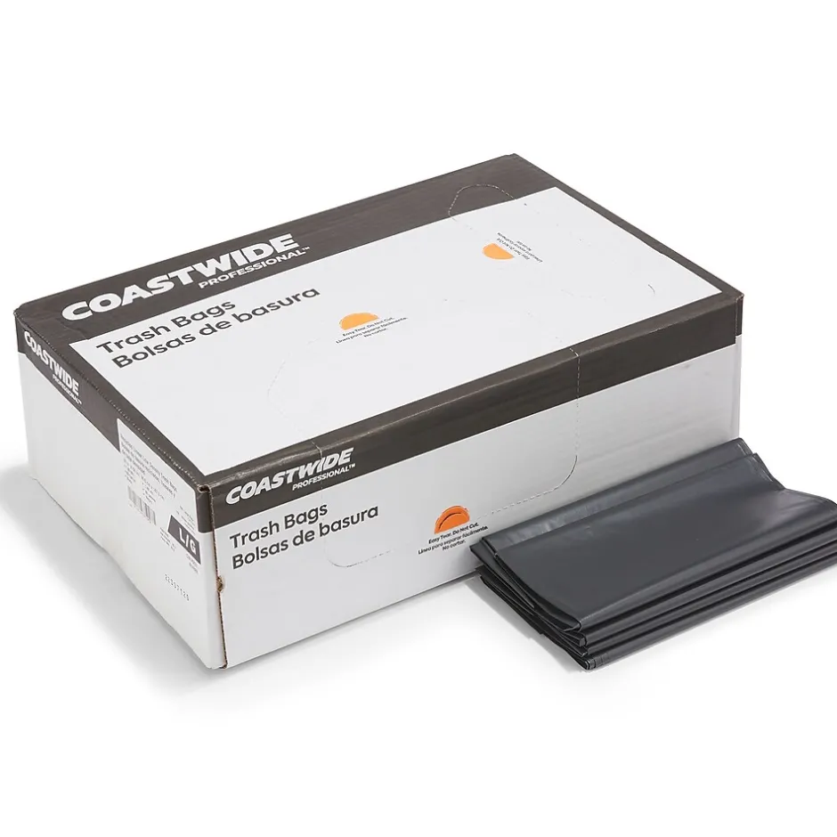 Handle garbage discreetly with these black trash bags. The 55 to 60-gallon capacity offers plenty of room for industrial use, taking on large and heavy items for quicker cleanup. These heavy-strength Coastwide Professional™ heavy-strength trash bags are made with reprocessed resin to resist puncturing by sharp objects and are packaged in a 100-count carton to address the needs of job sites and public waste management demands.