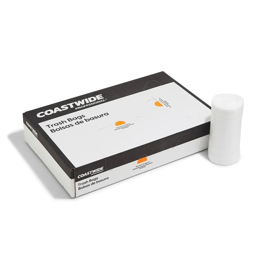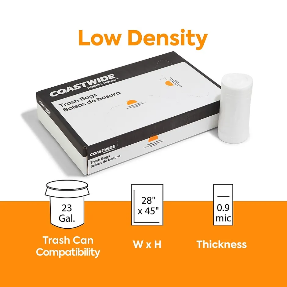 Get rid of refuse from the break room, washroom or other shared spaces with these AccuFit trash bags. The clear material delivers a view of the contents, helping prevent theft, while the low-density polyethylene prevents heavy items from stretching and ripping to avoid leaks, making them suitable for cafeterias and public areas. These Coastwide Professional™ AccuFit trash bags hold up to 23 gallons of waste as an effective maintenance solution.