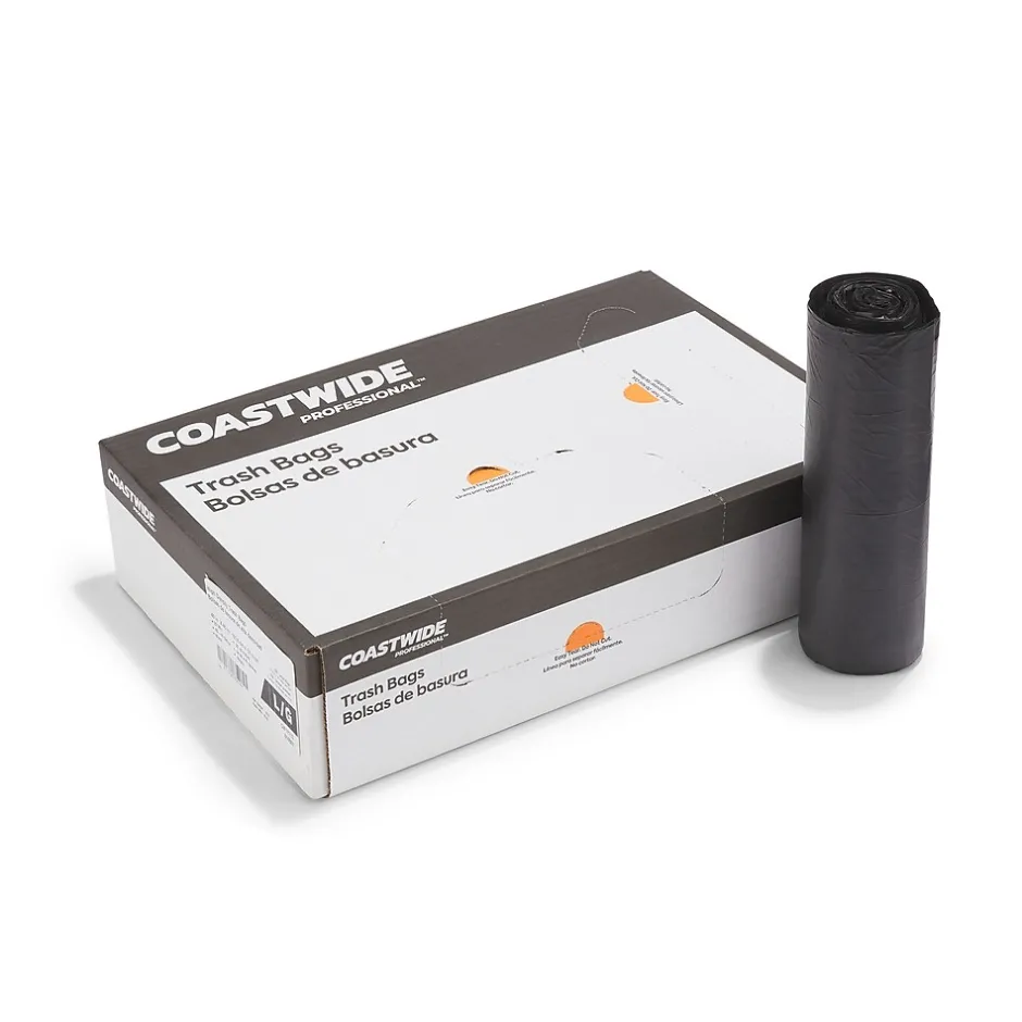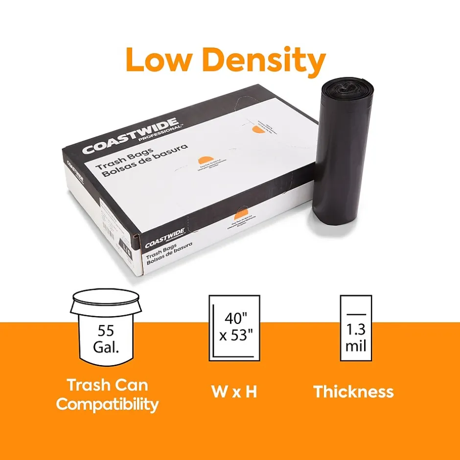 Enjoy convenient waste disposal with these trash bags. Low-density polyethylene offers strength to hold up to 55 gallons of refuse without tearing, making the bags perfect for areas that accumulate large amounts of garbage. The coreless rolls help save storage space, and perforated openings allow easy dispensing. These Coastwide Professional AccuFit trash bags are black to conceal the contents and give the workplace a clean appearance.