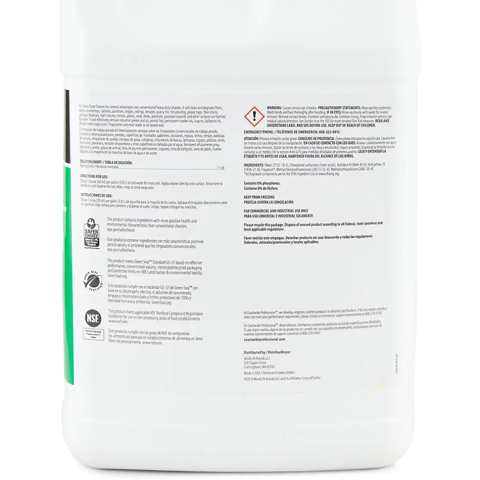 The Coastwide Professionalâ„¢ Heavy Duty Cleaner and Degreaser 65 has several advantages over conventional heavy duty cleaners. It will clean and degrease floors, walls, countertops, cabinets, partitions, ledges, ceilings, terrazzo, quarry tile, tile grouting, grease traps, floor drains, garbage disposals, light fixtures, mirrors, plastic, vinyl, desks, porcelain, porcelain enamel, and other surfaces not harmed by water. It will effectively remove industrial grease and oil, animal fats, permanent marker ink, crayons, ballpoint ink, shower room soap scum, fingerprints, and most water or oil-based soils.