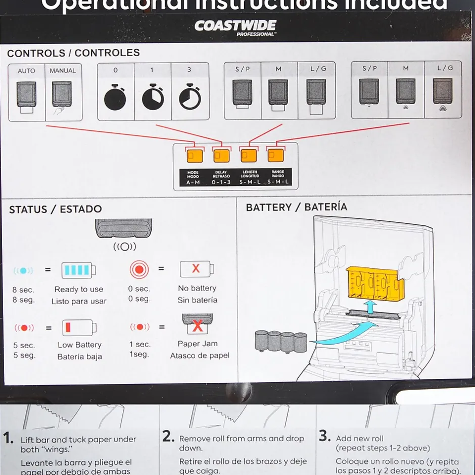 - Features push bar to manually dispense paper towels if batteries need to be changed