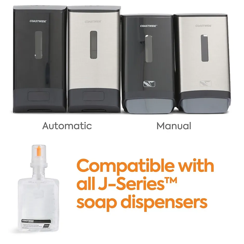 Make it easy for maintenance staff to reload dispensers with the color-coded labels on this foaming hand soap. This 2-pack of Coastwide Professionalâ„¢ J-Series fragrance-free foam hand soap is compatible with both automatic and manual J-Series dispensers for a precise fit. This foam hand soap washes away dirt with effective results with no added fragrance.