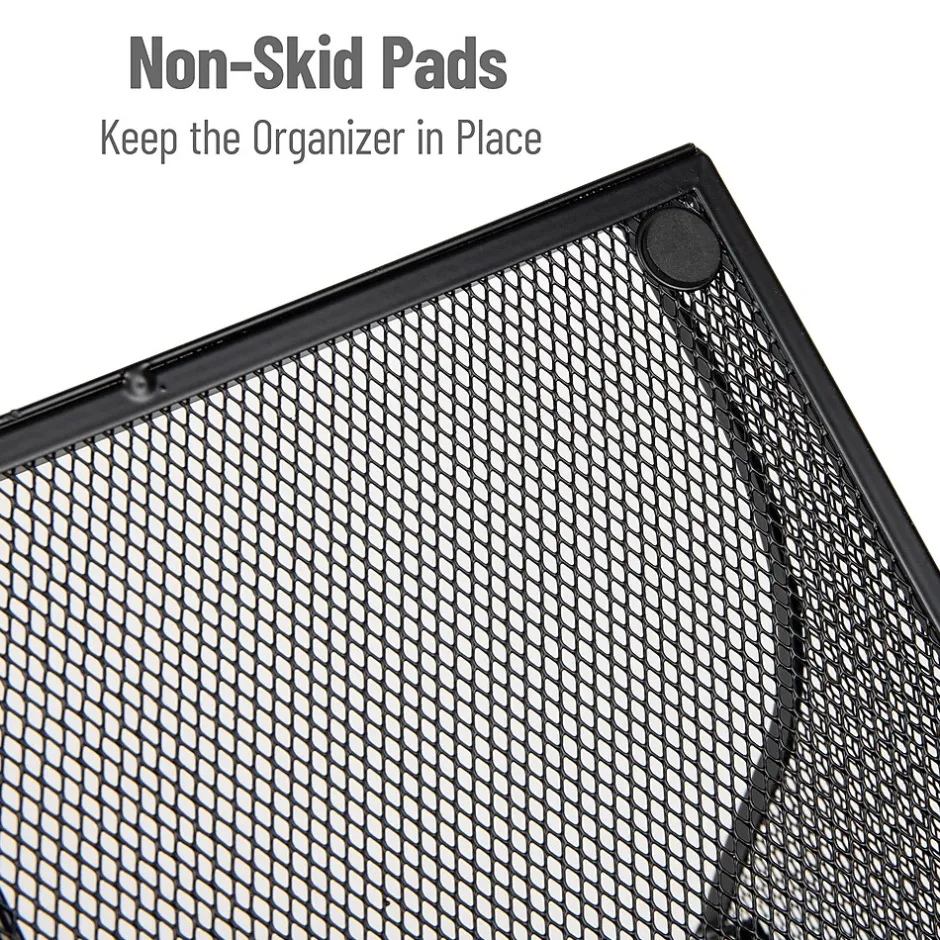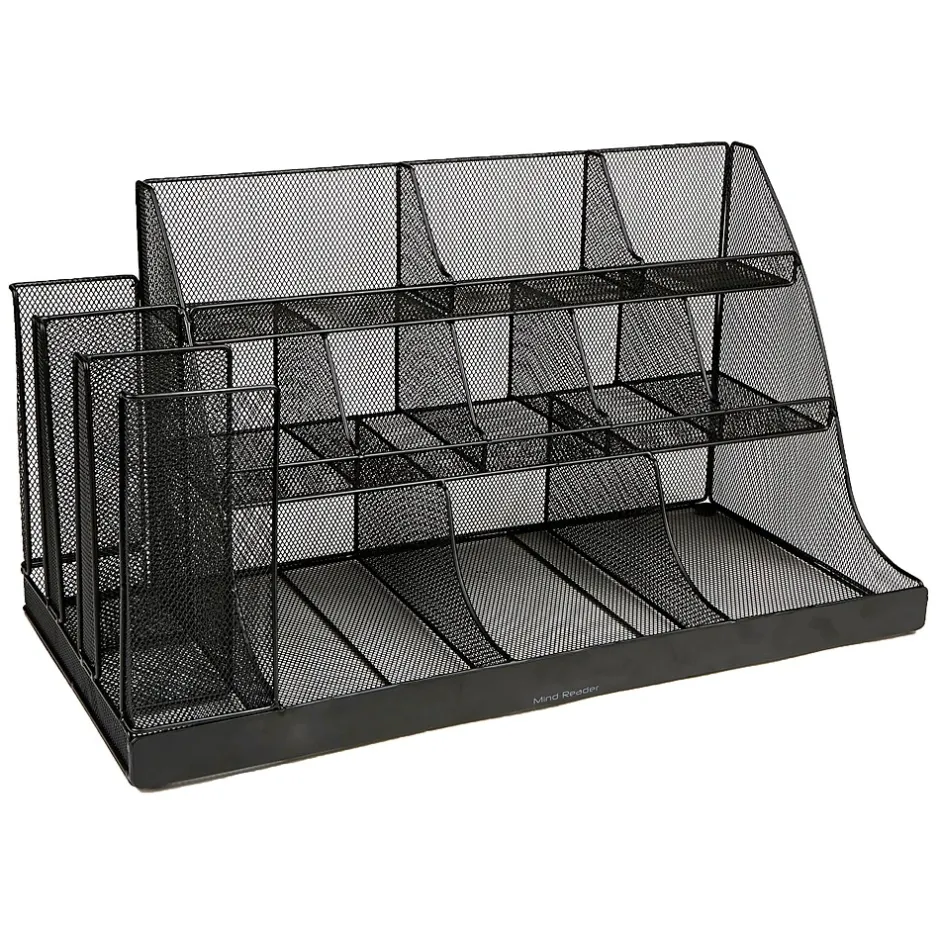 Elevate your coffee breaks with this expansive 3-tiered, 14-compartment cup, condiment, and snack organizer, eliminating chaos and unusable items. This station elegantly showcases items for easy access, catering to diverse preferences. It’s an ideal addition to hotel lobbies, breakrooms, hospitality suites, restaurants, and office receptions.Beyond coffee cups, condiments, and snacks, this versatile organizer serves creatively on countertops or in cabinets. Varied compartment sizes excel at organizing office supplies like pens, tape, rubber bands, and tacks. It’s equally adept at storing art supplies such as paintbrushes, glue sticks, scissors, and more.Maintenance is effortless – wipe with a damp cloth or rinse for stubborn messes. Built with durable metal mesh, it’s ready to use out of the box. Rubber grips keep it steady on countertops and in cabinets.Compact, lightweight, and robust, this organizer is travel-ready. Take it to hotels or dorm rooms, ensuring a well-organized coffee break wherever you go. It’s a thoughtful gift for travelers, students, business owners, and parents aiming for an easy snack station.