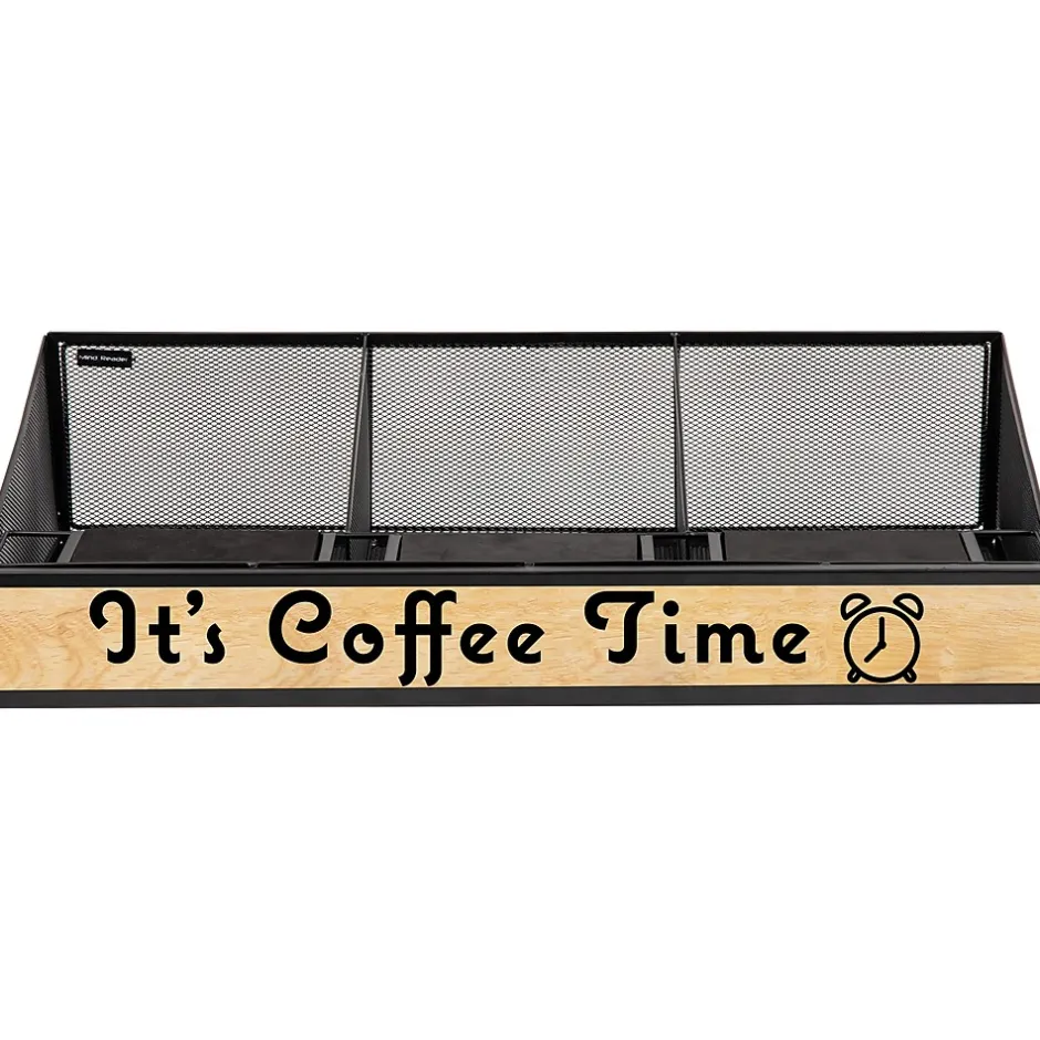 - Sleek and Seamless Design: The black wire mesh construction of this organizer effortlessly complements most kitchen or breakfast bar decor, while the “It’s Coffee Time” sign adds a friendly touch