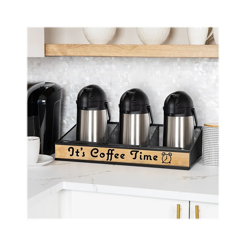 Look no further than this stylish and practical coffee station! The front of the station proudly displays the sign “It’s Coffee Time,” reminding everyone that their caffeine fix is just a few steps away.This coffee station features ample space for up to three standard-sized coffee airpots or carafes (not included), ensuring that there’s enough coffee to go around. The 6-inch height in the back provides stability for the carafes while they’re being used, so you don’t have to worry about any spills or messes.In addition to its functionality, this coffee station is also designed to keep your kitchen countertop clean and tidy. The front of the organizer includes a convenient ledge to hold coffee cups as they’re being filled, with an absorbent lip to catch any drips from the coffee or carafe.Say goodbye to assembly headaches with this no-assembly-required organizer. With its sleek design and durable construction, this coffee station is perfect for daily use and can be easily cleaned with a soft cloth and soapy water. It measures 24 inches long and is a great addition to any home kitchen, office break room, or bed and breakfast.