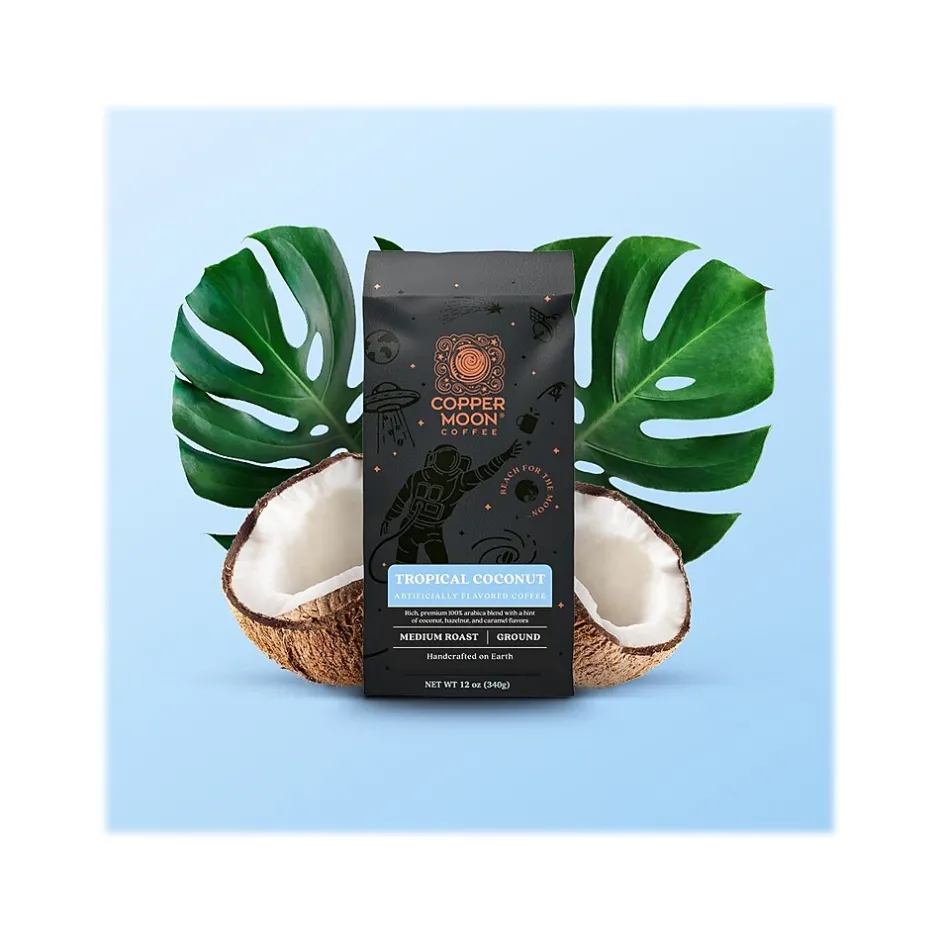 The Copper Moon Coffee Tropical Coconut artificially flavored coffee is a premium blend that pours the essence of the tropics into every cup. Delivering a low-acidic blend of the finest Central and South American coffee beans, it is enhanced with a hint of tropical coconut, hazelnut, and caramel flavors.