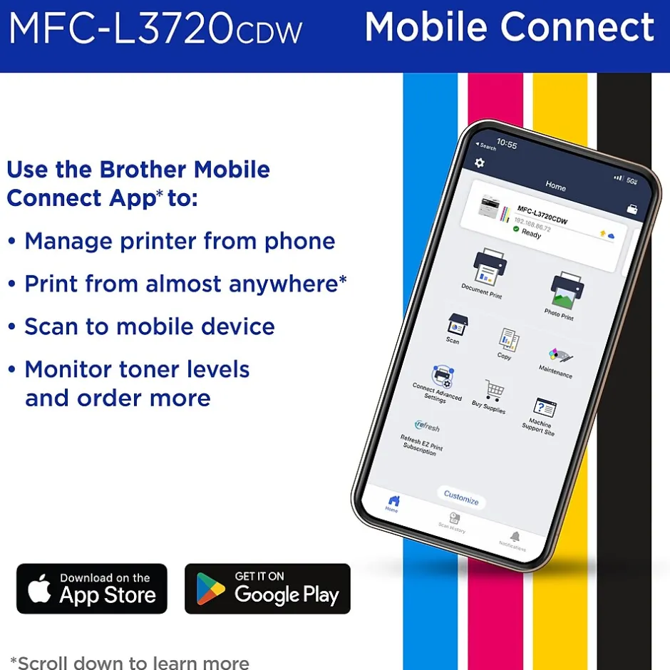 - PRINT FROM VIRTUALLY ANYWHERE. Brother Mobile Connect app puts the power of printer management in your hands. Print remotely, scan to mobile app, monitor toner levels, and reorder Brother Genuine supplies.(8)