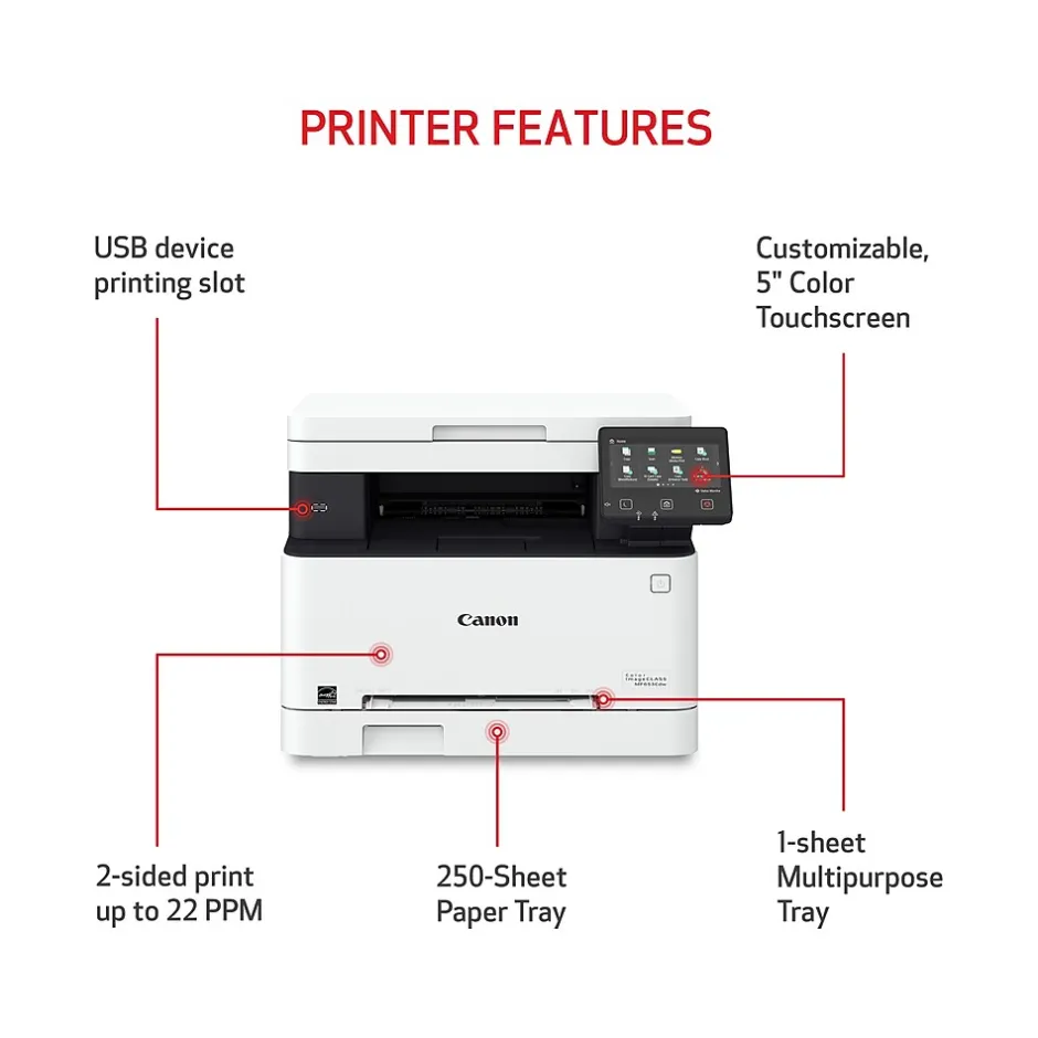 Canon Color imageCLASS’s diverse features and durability give you the confidence and flexibility to print everything from beautiful photos to impressive documents at home and in your small office. The MF653Cdw offers print, scan, and copy capabilities and can print up to 22 pages per minute. High-capacity toner option keeps up with your printing needs and limits toner replacement interruptions. Connect this printer to a wireless network in four simple steps. Print on the go with Canon PRINT Business, Apple AirPrint, and Mopria Print Service. Compatible with Windows, macOS, and ChromeOS. Features a compact design.