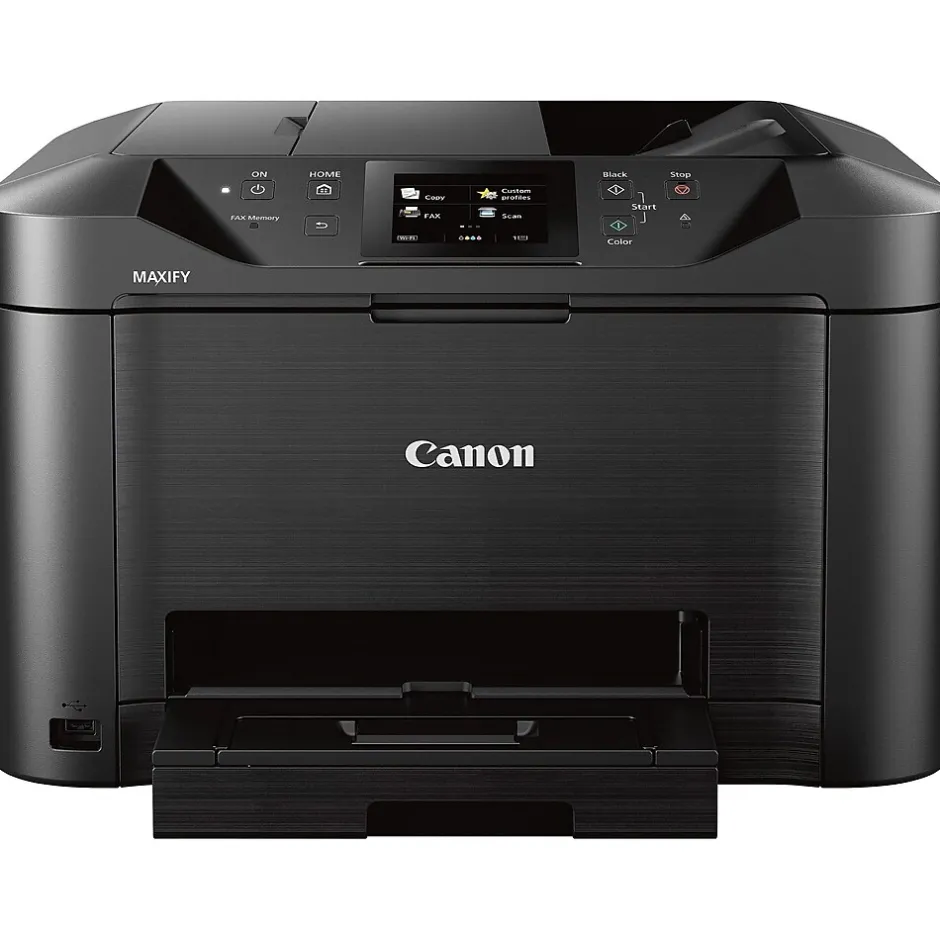 Produce sharp, detailed documents, scan stacks of records, and make accurate copies with this MAXIFY multifunction color inkjet printer. Featuring wireless LAN and Ethernet connectivity, this device lets you print from and scan to mobile devices via cloud printing services and easily integrates into office networks. High-precision inkjet printing technology delivers a maximum print resolution of 600 x 1200 dpi and enhances presentations with vivid color and sharp, detailed images. Boasting print speeds of up to 24 black and white pages per minute, this machine easily keeps up with office printing needs. A built-in flatbed scanner with an optical resolution of up to 1200 x 1200 dpi captures documents in sharp detail, perfect for digitizing important records. This Canon MAXIFY printer lets you print directly from flash drives and other storage media with a high-speed USB port.