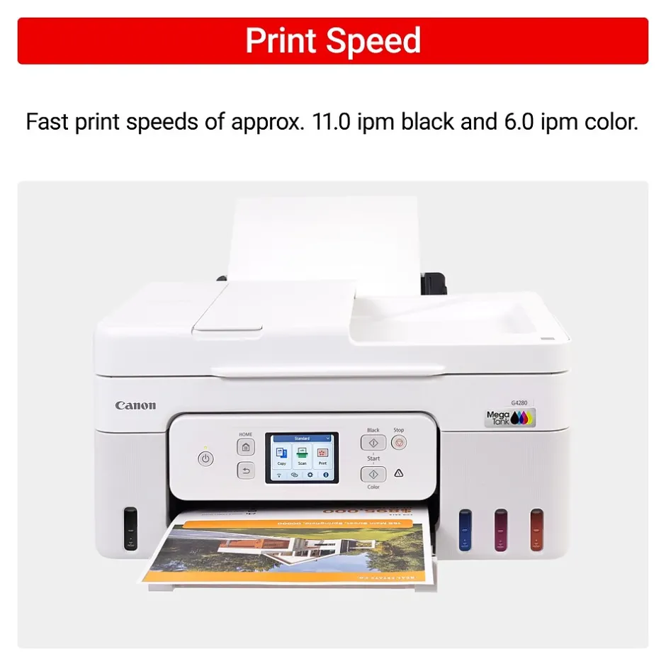 Designed for home and home offices, the Canon PIXMA G4280 MegaTank All-in-One inkjet printer delivers high-quality, low-cost printing, and outstanding wireless connectivity in a compact size. Get serious print productivity with a high page yield of up to 6,000 Black / 7,700 Color pages per full ink bottle set and a low cost per print – MegaTank means Mega Savings. The PIXMA G4280 comes with a full set of ink, so you can print with confidence. The PIXMA G4280 is easy to set up and maintain and offers great media versatility to print on a variety of media types and sizes, including photo paper, envelopes, banners and more. Use Poster Artist Online to create professional-posters, banners and signage. Print both documents and photos on a variety of paper types using a hybrid ink system with pigment black for sharp black text and dye-based colors for vivid borderless photos up to 8.5” x 11”. Produce crisp, colorful documents quickly and cost-effectively with fast print speeds and a high quality 4-color pigment-based ink system. Keep printing with a plain paper capacity of up to 100 sheets or 20 photo sheets (4”x6”). Easily connect and print through high-speed USB or wirelessly from computers or mobile devices. This comes with a 1-year limited warranty and is backed by Canon’s Service and Support network.