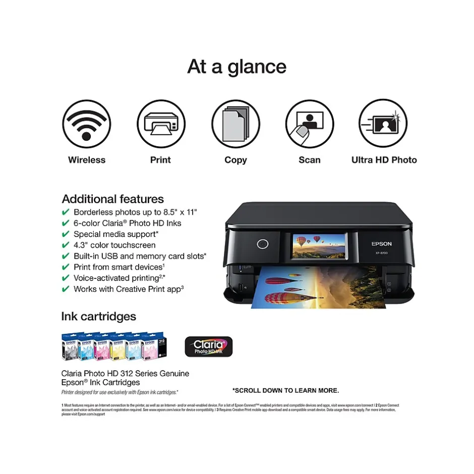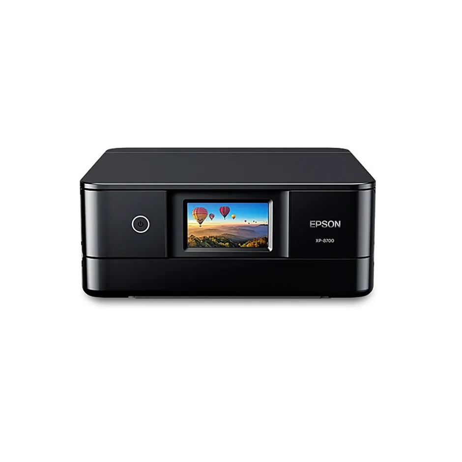 Easily print professional-quality photos at home with the Epson Expression Photo XP-8700 printer. Featuring brilliant six-color Claria Photo HD inks paired with Epson’s precise MicroPiezo technology, this innovative all-in-one delivers vibrant borderless prints up to 8.5″ x 11″ with astounding detail and accuracy. Designed for convenience, the XP-8700 offers a large 4.3″ color touch screen for intuitive setup and navigation, a built-in scanner and copier, and separate trays for photo and specialty papers. Great for creative enthusiasts, this solution maximizes productivity with fast wireless printing and includes the Epson Smart Panel app for easy printing from laptops and smart devices.