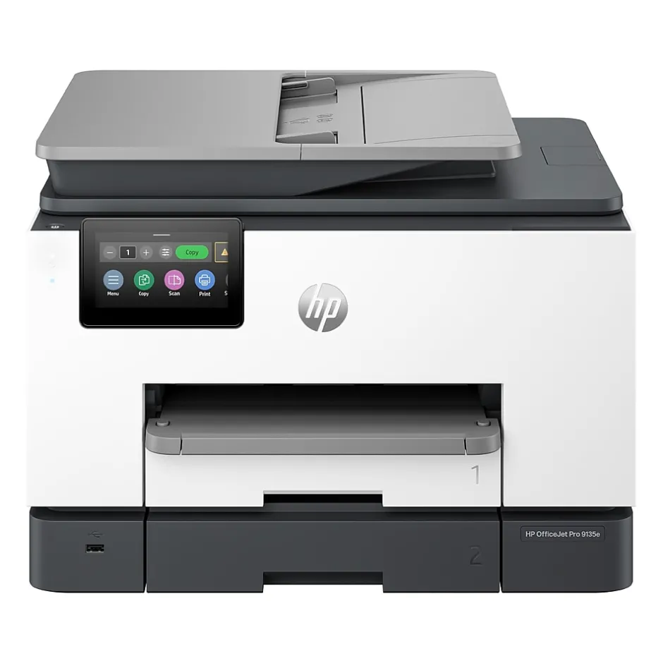 The HP OfficeJet Pro 9135e delivers fast color printing, 500-sheet paper capacity, and 2-sided scanning and copying. It includes wireless and printer security capabilities to keep your multifunction printer up to date and secure.