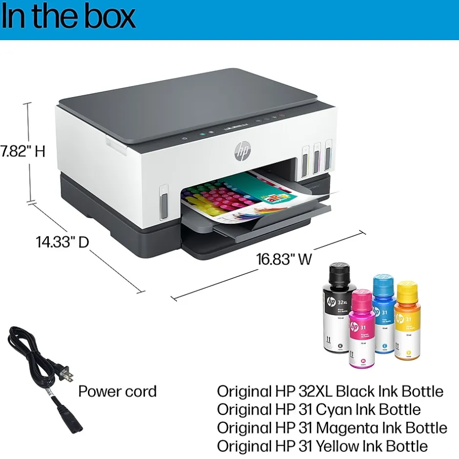 - WHAT’S IN THE BOX – 2H0B9A HP Smart Tank 6001 All-in-One Printer, Original HP 32XL Black Ink Bottle, Original HP 31 Cyan Ink Bottle, Original HP 31 Magenta Ink Bottle, Original HP 31 Yellow Ink Bottle, Ink caution flyer, Setup guide, Reference guide, Regulatory flyer, Power cord.